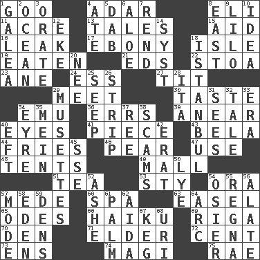ACROSS 1. Thick or sticky substance 4. The sixth month of the Jewish calendar 8. Connecticut Ivy Leaguer 11. 1/640 square mile 13. Falsehoods 15. Assist 16. Path through which fluid escapes 17. Dark wood 18. Capri or Wright 19. Consumed 21. Begley and Asner 22. Portico 23. A saturated hydrocarbon 24. Double-curved letter 27. Teat (slang) 29. Rendezvous 30. Clothes sense 34. Australian flightless bird 36. Blunders 39. Approach 40. Sight organs 41. Part 43. Actor Lugosi 44. Strips of potato fried in deep fat 46. Lightbulb-shaped fruit 47. Purpose 48. Portable shelters 49. Shopping center 51. Afternoon social gathering 53. Filthy place 54. Mouth or opening 57. Ancient Persian 60. Health resort 63. Artist's stand 65. Lyric poems 66. Japanese verse 69. Capital of Latvia 70. Lair 71. A person who is older than you are 72. Penny 73. Followers of ems 74. Wise men 75. Actress Charlotte DOWN 1. An organ shaped like a helmet 2. Sea 3. Declaim 4. Had dinner 5. Small moist lump or mass 6. Medicinal plant 7. Tear apart 8. 90 degrees 9. _ and Stitch 10. The main thing one is thinking about 12. Supplement with great effort 14. System (abbr.) 18. Byzantium, centuries later 20. Born 25. Ooze 26. Long narrow piece of something 28. Call ___ day 29. French bagpipes 31. Observes 32. Lie 33. Epoch 34. Jane of fiction 35. Count _ (2 wds.) 37. To sift 38. Fraudulent business schemes 40. Lizard (obsolete) 42. Part of Q.E.F. 45. Compass dir. 50. Sodium hydroxide 52. American tennis player Robert 54. Flexible twig of a willow tree 55. Canadian anthropologist Darnell 56. Having winglike extensions 57. Method 58. Genesis locale 59. Habitations of wild animals 61. Inside of hand 62. Opera by Verdi 64. Curve 67. Cask 68. RI univ.
