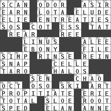 ACROSS 1. Glance over 5. Aroma 9. SW Saudi Arabia district 13. Merit 14. Globular water bottle used in Asia 15. Evade 16. Writer Wiesel 17. Pleas 19. Mayday 20. Small bed 21. Double-curved letter 22. Make lace 23. Rump 25. To riddle 26. "_ and Lucy" (Charlie Brown theme song) 30. Toward shelter 34. Black 35. Do some clerical work 36. Simple or foolish person 39. Remove soap 42. It's straight from the horse's mouth 43. Fastener 44. Cell (Danish) 46. Edible starchy tuberous root 47. Rings 48. Elected rep. 51. US Secretary of Labor Elaine L. _ 54. Sep. follower 57. Bear (Spanish) 58. What Jean-Claude Killy likes to do 60. Tate display 62. Conciliate 65. 4th largest of the Great Lakes 66. Add up to 67. A type of plum 68. Carrot, for example 69. Broke a traffic law 70. Flair 71. Queen of England 1702-14 DOWN 1. Observes 2. Bodily heat indicating an inflammation 3. Ascend 4. Compass dir. 5. Margarine 6. Do not 7. Baseball player Mel 8. More valued for its uncommonness 9. The first octave above the treble staff 10. Costume for a special activity 11. It may be bright or harebrained 12. Respite 15. Comfort 18. Compass dir. 20. Baby bed with high sides 24. City in Syria 27. And not 28. Corn or form start 29. Synchronize (abbr.) 30. Anew 31. Falsehood 32. Biblical high priest 33. Car or cant ending 36. Fast jet (abbr.) 37. _ tizzy (2 wds.) 38. Impair 40. Ocean 41. Pipe bend 45. Locales 48. The visible part of the earth's surface 49. Eastern Standard Time (abbr.) 50. Annoying sound 52. Composer Copland 53. Constellation of myth 54. Elects 55. Riding implement 56. Haul 58. Portico 59. Peachy ____! 61. Wig 63. Groovy apt. 64. Everything 65. Period