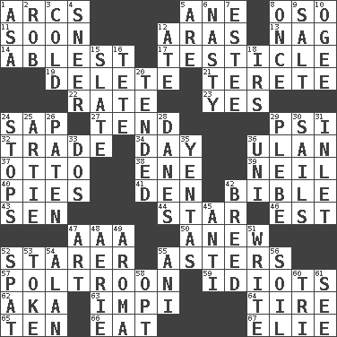 ACROSS 1. Curves 5. One (Scot) 8. Bear (Spanish) 11. Within a short period 12. Caspian sea tributary 13. Tired old horse 14. Most capable 17. A testis 19. Keyboard key 21. Cylindrical with tapered ends 22. Assign a rank or rating to 23. Consenting reply 24. Plant excrement 27. Look after 29. Air pressure measure (abbr.) 32. Exchange 34. 24 hours 36. ____ Bator, Mongolia 37. Von Bismarck 38. Compass dir. 39. Famous astronaut Armstrong 40. Sliced desserts 41. Lair 42. God's Word 43. Elected rep. 44. Play the lead 46. Eastern Standard Time (abbr.) 47. Auto club (abbr.) 50. Afresh 52. A viewer who gazes fixedly 55. Michaelmas daisies 57. Characterized by complete cowardliness 59. Foolish or stupid persons 62. Alias (abbr.) 63. Body of Kaffir warriors 64. Hoop that covers a wheel 65. "___ Little Indians" 66. Erode 67. Writer Wiesel DOWN 1. White ___ sheet 2. Director Reiner 3. Lacking warmth 4. Contemptuous expression 5. "We ___ not amused" (Victoria) 6. Thoroughly unpleasant 7. First name in cosmetics 8. At one time in the past 9. Table seasoning 10. Double curve, resembling the letter S 12. Had dinner 15. Chalkboard 16. False hair 18. Big collection agency 20. Looked after 24. Discontinues 25. Nick name for Arthur 26. Eucharist need 28. Natives or inhabitants of Denmark 29. First-year military academy student 30. Moves on water 31. An arm off of a larger body of water 33. Two (Sp.) 35. Gossips 36. Corn or form start 42. A special lineage 45. Opposed to 47. Tate display 48. Nest on high 49. Odor 51. Compose 52. Argument over a trivial matter 53. Casino tip 54. ____ Jay Lerner 55. Cuckoo 56. Earth 58. Choose 60. Three (prefix) 61. Observe