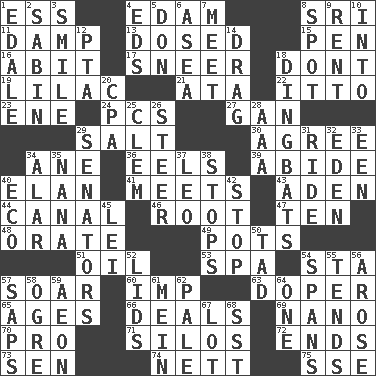 ACROSS 1. Double-curved letter 4. Dutch treat 8. _ Lanka 11. Moist 13. Administered medicine 15. Writing instrument 16. "This won't hurt ____!" 17. Scornful expression 18. Do not 19. Pale purple color 21. _ moment's notice (2 wds.) 22. "Tell ____ the Marines!" 23. Compass dir. 24. Personal Computers (abbr.) 27. Separate the seeds from cotton 29. Table seasoning 30. Match 34. One (Scot) 36. Snakelike fish 39. Remain 40. Style 41. Confronts 43. An important port of Yemen 44. Lessep's creation 46. Carrot, for example 47. Nine, plus one 48. Speak pompously 49. Cooking vessels 51. Lubricate 53. Health resort 54. R.R. building 57. Fly high 60. Mischievous child 63. Drug addict 65. Ripens 66. Allots cards 69. Billionth: prefix 70. Adept person 71. Grain storage towers 72. Conclusions 73. Elected rep. 74. Remaining after all deductions 75. Compass dir. DOWN 1. Peak District village in England 2. Unit of acoustic absorption 3. Grin 4. Begley and Asner 5. Spanish title 6. Toward the sea 7. Confront 8. Blemish 9. Monthly bill 10. To the inside or interior of 12. Parent Teacher Association (abbr.) 14. To trail on the ground 18. Empty-headed or silly people 20. Accounting whiz (abbr.) 25. To starve (Brit.) 26. Navigate 28. Auto club (abbr.) 29. Legislators 31. Travel on or in a vehicle 32. Paradise 33. Car or cant ending 34. Having or resembling wings 35. Nanny 37. Lion 38. Obstructs or blocks passage 40. Environmental prefix 42. Close up, plug up 45. Luau accessory 50. Small boy 52. Flaplike coverings 54. Connects, as a bridge 55. Watches over 56. Came up 57. Plant excrements 58. Legendary monster 59. A really long time 61. Count _ (2 wds.) 62. Light colored 64. Single 67. Car dealer's back yard 68. Fast jet (abbr.)