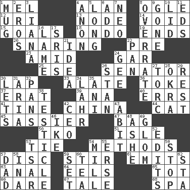 ACROSS 1. Cartoonist voice _ Blanc 4. Actor Alda or Thicke 8. Stare at amorously 12. RI univ. 13. Thickened enlargement 14. State of nonexistence 15. Purposes of endeavors 18. Southwest Nigerian state 19. Extremities 20. Catching in a trap 22. Before (prefix) 23. Among 24. Slender fish 25. Compass dir. 26. Elected representative 30. Infant locale 33. Having winglike extensions 36. Casino tip 37. Part of Q.E.F. 39. Santa ___, CA 40. Blunders 41. Prong on a fork 42. Large country 44. Feline 45. More lively and spirited 47. Paper or plastic container 50. Ring climax 51. Capri or Wright 53. Standoff 54. Modes 57. Compact _ 59. Use a swizzle stick 61. Sends forth 63. Of or related to the anus 64. Snakelike fish 65. Small child 66. Have the gumption 67. Falsehood 68. Health resort DOWN 1. Java container 2. Greek god of love 3. Climbing, woody, usually tropical vines 4. At once, immediately (arch.) 5. Protracted 6. Increase 7. Modern: prefix 8. Make much ado about nothing 9. Went 10. Hat (slang) 11. Begley and Asner 16. Unable to walk 17. Indian titles of respect 21. The content of cognition 22. Baking dish 24. Unit of force equal to gravity 26. Comedian Laurel of Laurel & Hardy 27. Torque (variant) 28. Gumbo ingredient 29. Repose 30. Allows 31. Roberta Peters solo 32. Baking dishes 34. Cowardly lion portrayer 35. Black tropical American cuckoo 38. A testis 42. Corporate head (abbr.) 43. "This won't hurt ____!" 46. D.D.E's nickname 48. American tennis player Robert 49. Take by theft 52. Prepares for publication 53. Russian ruler of old 54. Place where flour is made 55. Celtic language 56. Constrict 57. June honoree 58. _ tizzy (2 wds.) 59. Arrange properly for use 60. Beverage made from leaves 62. R.R. building