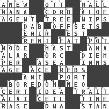 ACROSS 1. Afresh 5. Baseball player Mel 8. Promenade 12. Nanny 13. Drawstring 15. Medicinal plant 16. Representative 18. Woody plant 19. Cuts off 20. Pat or tap gently 22. Cancels 24. Arab leader 26. Eastern Standard Time (abbr.) 27. Painter Guido (1575-1642) 28. Consume 29. Plant holder 32. Connecting point 35. Vertical spar for supporting sails 37. Housemaid (var.) 38. Having or resembling wings 39. The grampus (Milton) 40. South Vietnam president (1954) 41. For each 42. At sea 43. Lodging establishments 44. Mature 45. Adept person 46. Confederate soldiers (slang) 49. Black tropical American cuckoo 50. Left side of a ship or aircraft 51. Mood resulting from idleness 55. Modern: prefix 56. Certainty 57. The main thing one is thinking about 59. Distinguishing feature 63. Jai _ 64. To provide with a ceiling 65. Prong on a fork 66. To erase 67. Heredity factor (abbr.) 68. Comedian Laurel of Laurel & Hardy DOWN 1. Santa ___, CA 2. Tired old horse 3. Compass dir. 4. Roamer 5. Sep. follower 6. "Corrida" creature 7. Not kosher 8. French painter Edouard 9. Came down and settled, as after flight 10. Chops off 11. French article 14. Outscore 17. Docile 21. Storage container 23. Fast jet (abbr.) 25. Full of chinks, cracks, or crevices 28. Fortification 29. Ache 30. Presage 31. Scottish caps 32. California wine valley 33. Cassini of fashion 34. Have the gumption 36. "We ___ not amused" (Victoria) 40. What propaganda does 42. Being or containing an acid 45. A saturated hydrocarbon 47. A really long time 48. Cy Young winner Saberhagen 49. Nick name for Arthur 51. Actor Lugosi 52. Mouths or openings 53. Wrote a lyric poem 54. Count _ (2 wds.) 56. Auto 58. Insect wing 60. Small island 61. _ tizzy (2 wds.) 62. "___ Little Indians"