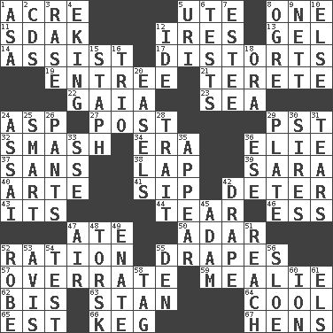 ACROSS 1. 43,560 square feet 5. Shoshoni 8. Single 11. Neighbor of Neb. 12. Angers 13. Set 14. Aid 17. What propaganda does 19. Main course 21. Cigar-shaped 22. Greek goddess of the earth (variant) 23. Ocean 24. Viper 27. Mail 29. Pacific Standard Time (abbr.) 32. Box-office sellout 34. Period 36. Writer Wiesel 37. Without 38. Pet locale 39. "Two Mules for Sister ____" 40. Johnson of "Laugh-In" 41. Small drink 42. Prevent from occurring 43. ___ a Wonderful Life 44. Lacerate 46. Curvy letter 47. Had dinner 50. The sixth month of the Jewish calendar 52. Food allowance for one day 55. Window treatments 57. Make much ado about nothing 59. Ear of corn 62. Again 63. Comedian Laurel of Laurel & Hardy 64. Calm and collected 65. Eastern Standard Time (abbr.) 66. Barrel 67. Coop moms DOWN 1. White ___ sheet 2. Music discs 3. To erase 4. Supplementing with great effort 5. RI univ. 6. Trials 7. First name in cosmetics 8. Legendary monster 9. Remaining after all deductions 10. Otherwise 12. Binary compound 15. Staphylococcus 16. Musical group of three 18. Mouth or opening 20. Artist's stands 24. Slender Brazilian palm 25. Don Adams' spy role 26. Leg coverings 28. Distinguishing feature 29. Food holder 30. Founders of families 31. Lacerates 33. Compass dir. 35. Seem 36. Compass dir. 42. Window treatment 45. First man 47. Atmosphere 48. Cod relative 49. Maternal 51. Arrive at 52. Loose flowing garment 53. Advice 54. Trial 55. Lair 56. _ gin 58. Label 60. Electrically charged atom 61. Raised railways
