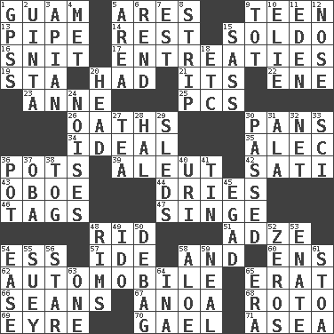 ACROSS 1. Island territory of the United States 5. Ancient Greek god of war 9. Adolescent 13. Corncob 14. Relief 15. Twentieth part of a lira 16. In a ____ (agitated or irritated) 17. Pleas 19. R.R. building 20. Possessed 21. ___ a Wonderful Life 22. Compass dir. 23. Queen of England 1702-14 25. Personal Computers (abbr.) 26. Curses 30. Zero-star reviews 34. Standard of perfection 35. Actor Baldwin 36. Cooking vessels 39. Native American of Southwest Alaska 42. Suttee (variant) 43. Mitch Miller's instrument 44. Frees from moisture 46. Labels 47. Scorch 48. To free from 51. Edge tool used to cut and shape wood 54. Curvy letter 57. Binary compound 58. Also 60. Followers of ems 62. Car 65. Part of Q.E.F. 66. Actors Connery and Penn 67. Small Philippine buffalo 68. Printing process, for short 69. Jane of fiction 70. Highlander 71. At sea DOWN 1. Global Positioning Systems (abbr.) 2. National forest in Provo, Utah 3. Bee-related 4. Was introduced to 5. Length times width 6. Tear apart 7. Eastern Standard Time (abbr.) 8. Long narrow piece of something 9. Small child 10. Writer Wiesel 11. Paradise 12. Sense of smell 15. Backtalk 18. And so on (abbr.) 20. Froth on beer 24. Annoying sounds 27. Afternoon social gathering 28. Actor Linden 29. Bobsleighs 30. Went by 31. Wing 32. Fish or hair follower 33. _-fi 36. Cooking vessel 37. Chief or king in Benin or Nigeria 38. Coat; cloak 40. RI univ. 41. Shallow baking pan 45. Mild oath 48. Basketball hoops 49. Wedding promise 50. Debunk (Brit. slang) 52. Nothings 53. Related on the mother's side 54. Relaxation 55. Chop _ 56. Play the lead 58. _ vera 59. Anneal 61. Portico 63. Single 64. _ tizzy (2 wds.) 65. Period