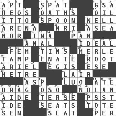ACROSS 1. Fitting 4. Argument over a trivial matter 8. Girls' org. (abbr.) 11. Vintage cars 13. Profane or obscene expressions 15. Petroleum 16. "Tell ____ the Marines!" 17. Soup utensil 18. Water source 19. Sports stadium 21. Medical imaging device (abbr.) 22. At sea 23. And not 24. _ tizzy (2 wds.) 27. Baking dish 29. Of or related to the anus 30. Standard of perfection 34. Opposite of masc. 36. Metal containers 39. Haggard of country music 40. Pack (down) 41. Related on the mother's side 43. Carrot, for example 44. Satellite of Uranus 46. The front part of a cuirass 47. Compass dir. 48. Distance measurement (Brit.) 49. Den 51. Viper 53. Nilotic language 54. Had dinner 57. To trail on the ground 60. Bear (Spanish) 63. Pitcher Ryan 65. Assistant 66. Laconic 69. Inconspicuous attention getter 70. Binary compound 71. Theater features 72. Haul 73. Elected rep. 74. Narrow board 75. For each DOWN 1. Believer in; advocate of (suffix) 2. Stone: prefix 3. Carrier 4. Mayday 5. Infant food 6. Smallest unit of an element 7. Son of Odin 8. Moves 9. Filth; sediment 10. Silent film actress Nazimova 12. Boy, to dad 14. Sever or remove by pinching or nipping 18. Nomad 20. The 18th letter of the Arabic alphabet 25. Nathan's nickname 26. Place in a line 28. Direct toward a target or goal 29. Electrical Measurement 31. Greek god of love 32. Medicinal plant 33. Allow 34. Conductor's collection 35. Give off 37. Tired old horse 38. Free from disturbance or agitation 40. Scottish cap 42. He sold his birthright 45. French article 50. Electrically charged atom 52. Plant holders 54. Columnist Joseph or Stewart 55. Clothes sense 56. Keyboard key 57. Raised platform 58. Travel on or in a vehicle 59. An important port of Yemen 61. Perceives with the eye 62. Of the mouth 64. Elect 67. R.R. building 68. Eastern Standard Time (abbr.)
