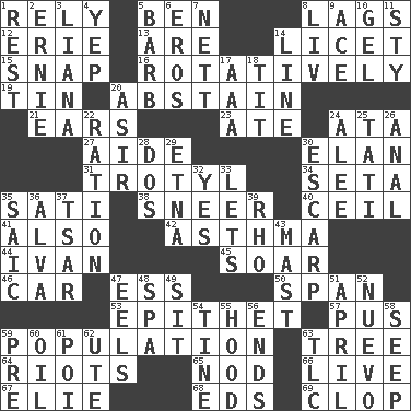 ACROSS 1. Trust 5. Benjamin's nick name 8. Straggles 12. 4th largest of the Great Lakes 13. "We ___ not amused" (Victoria) 14. It is permitted: Lat. 15. Fastener 16. Happening in regular succession 19. Shallow baking pan 20. Choose not to consume 21. Hearing organs 23. Had dinner 24. _ moment's notice (2 wds.) 27. Assistant 30. Liveliness 31. TNT 34. Stalk of a moss capsule 35. Suttee (variant) 38. Contemptuous expression 40. To provide with a ceiling 41. In addition 42. Respiratory problem 44. "Terrible" tsar 45. Fly high 46. Auto 47. Double-curved letter 50. Connect, as a bridge 53. Curse 57. Ichor 59. Census information 63. Relationship diagram 64. Disturbances 65. Allow head to fall sleepily 66. Moving, as bait 67. Writer Wiesel 68. Begley and Asner 69. Hoof sound DOWN 1. Respite 2. Bert's buddy 3. Woody, climbing, usually tropical plant 4. Slangy assent 5. Sharp remark 6. Greek god of love 7. Remaining after all deductions 8. 54 in ancient Rome 9. Adept person 10. Set 11. Filthy place 14. Actor's bit 17. American Automobile Association (abbr.) 18. Teat (slang) 20. SW Saudi Arabia district 22. Food allowance for one day 24. Toward shelter 25. Jacques of French films 26. Of or related to the anus 28. Two (Sp.) 29. Inactive volcano in Sicily 30. Fortification 32. It is so 33. Allows 35. Ketch in the Levant 36. Inventor's middle name 37. Russian ruler of old 39. 17th letter of the Greek alphabet 43. Vertical spar for supporting sails 47. Snakelike fish 48. Health resort 49. Be seated 51. Showery time 52. New (sp.) 54. Prong on a fork 55. Parka part 56. Conclusions 58. Ooze 59. Before (prefix) 60. Petroleum 61. Luau course 62. Shoshoni 63. Affectionate concern, for short