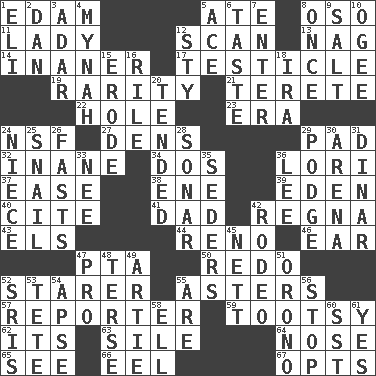 ACROSS 1. Dutch treat 5. Had dinner 8. Bear (Spanish) 11. Kenny Rogers chart-topper in '80 12. Examine hastily 13. Tired old horse 14. More lacking in sense or substance 17. One of the two male reproductive glands 19. Noteworthy scarcity 21. Cigar-shaped 22. Opening into or through something 23. Epoch 24. Overdraft (abbr.) 27. Lairs 29. Writing tablet 32. Lacking in sense or substance 34. Two (Sp.) 36. Australian parrot (variant) 37. Comfort 38. Compass dir. 39. Locale of original sin 40. Quote 41. Male parent 42. Rain (Swedish) 43. Raised railways 44. Former U.S. Attorney General Janet 46. Hearing organ 47. Parent Teacher Association (abbr.) 50. Make new 52. A viewer who gazes fixedly 55. Michaelmas daisies 57. News announcer 59. A girl or young woman (variant) 62. It is 63. Filth; sediment 64. Sense of smell 65. Observe 66. Snakelike fish 67. Elects DOWN 1. Biblical high priest 2. Daniel's nick name 3. The sixth month of the Jewish calendar 4. Non-adult bird? 5. Adept person 6. Clothes sense 7. Keyboard key 8. At one time in the past 9. Table seasoning 10. Double curve, resembling the letter S 12. Filthy place 15. Wear away 16. Cause heat under the collar 18. Retirement account (abbr.) 20. Looked after 24. Sibling's daughter 25. Slow-paced one 26. Goes without food and/or water 28. Underwater navigation system 29. Porridge 30. Sports stadium 31. Middle Eastern gold or silver currency 33. Born 35. Spring feasts 36. Area sheltered from the wind 42. Cowboy competition 45. Remaining after all deductions 47. Adept person 48. Laconic 49. Nick name for Arthur 51. U. of Maine site 52. Indian titles of respect 53. False hair 54. Domed church section 55. "We ___ not amused" (Victoria) 56. Halt 58. Pipe bend 60. Fast jet (abbr.) 61. Consenting reply
