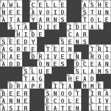 ACROSS 1. Leather borer 4. Cell (Danish) 9. American tennis player Robert 13. Born 14. Keep away from 15. Make senseless or dizzy 16. _ moment's notice (2 wds.) 17. Tall tales 18. Lacquered or enameled metalware 19. R.R. building 21. Pass on 22. Standard of perfection 24. Flintstone garb 26. Auto 27. Morally degraded 29. Elected reps. 30. Match 31. Adolescent 33. Three (prefix) 36. Actress Charlotte 37. Popular '50s hangout 40. Friend of Pooh 41. Increase 42. Washington bills 43. Sea 45. Change direction abruptly 47. Hits or strikes with great force 48. Label 49. Froth on beer 50. Window treatment 52. Call ___ day 54. Madame (abbr.) 56. Fermented drink made from hops 57. Snob 59. Lyricist Gershwin 61. Singer Murray 62. Learning spot: Fr. 63. 54 in ancient Rome 64. SW Saudi Arabia district 65. Eroded 66. Area sheltered from the wind DOWN 1. Santa ___, CA 2. Moistens 3. Tough but pliablecoriaceous 4. Island 5. Dodge 6. Australian parrot (variant) 7. Actor's bit 8. Begley and Asner 9. Michaelmas daisies 10. Portico 11. Frame or body of a ship 12. Compass dir. 20. Assistant 22. Ancient Celtic tribe of eastern Britain 23. Daniel's nick name 25. Colored 27. "Two Mules for Sister ____" 28. Mild oath 29. Perceives with the eye 31. Prong on a fork 32. First lady 33. Excercise machine 34. Wander 35. Charged atoms 38. Makeup applied to the cheeks 39. Sense of smell 44. Burrowing marine mollusk 45. A viewer who gazes fixedly 46. Infant locale 49. White Person, in Hawaii 50. Habitations of wild animals 51. Painter Guido (1575-1642) 52. South American Indian 53. A blast of a horn 55. One of the Great Lakes 56. Sound made by sheep 57. Perceive with the eye 58. "___ Little Indians" 60. "___ Maria"