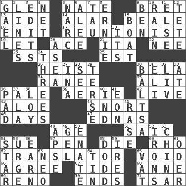 ACROSS 1. Small, secluded valley 5. Nathan's nickname 9. Cy Young winner Saberhagen 13. Helper 14. Having or resembling wings 15. Memphis, Tenn. Street 16. Send forth 17. One who advocates reunion 19. Allow 20. Adept person 21. Call ___ day 22. Born 23. Fast planes 25. Eastern Standard Time (abbr.) 26. Robbery 30. Actor Lugosi 34. Indian princess (variant) 35. Came down and settled, as after flight 36. Light colored 39. Nest on high 42. Moving, as bait 43. Medicinal plant 44. Derisive sound 46. 24-hour periods 47. Ferber et al. 48. Mature 51. Ketch in the Levant 54. Take to court 57. Fenced enclosure 58. Expire 60. 17th letter of the Greek alphabet 62. Interpreter 65. Null 66. Match 67. Periodic rise and fall of the sea level 68. Singer Murray 69. Western Nevada city 70. Extremities 71. Russian ruler of old DOWN 1. Highlander 2. Citrus fruits 3. Prepares for publication 4. Fish or hair follower 5. Drug cop 6. Toward shelter 7. The 19th letter of the Greek alphabet 8. Bert's buddy 9. Benjamin's nick name 10. Precipitation 11. Otherwise 12. False hair 15. Water vessel 18. ___ a Wonderful Life 20. At sea 24. Trios 27. _ tizzy (2 wds.) 28. Observe 29. Laconic 30. Greek mezzo-soprano Agnes 31. Biblical high priest 32. 54 in ancient Rome 33. Had dinner 36. Writing tablet 37. In the manner of 38. Myrna of the movies 40. Indiana (abbr.) 41. Age 45. Raze (variant) 48. Domed church section 49. Set 50. Maternal 52. Metal shackles 53. Large country 54. Play the lead 55. Goad 56. Merit 58. Texas town _ City 59. Angers 61. River in Europe 63. Modern: prefix 64. Shallow baking pan 65. Large container
