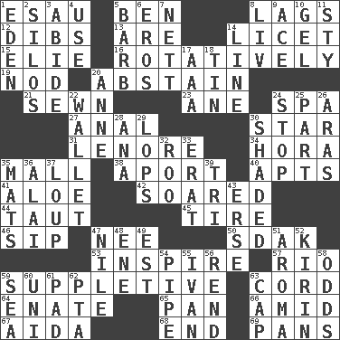 ACROSS 1. He sold his birthright 5. Benjamin's nick name 8. Straggles 12. Claim 13. "We ___ not amused" (Victoria) 14. It is permitted: Lat. 15. Writer Wiesel 16. Producing rotation 19. Allow head to fall sleepily 20. Choose not to consume 21. Stitched 23. One (Scot) 24. Health resort 27. Of or related to the anus 30. Play the lead 31. Poe poem 34. Israeli folk dance 35. Shopping center 38. To the left, to Queeg 40. Flats, for short 41. _ vera 42. Flew 44. Strained 45. Hoop that covers a wheel 46. Small drink 47. Born 50. Neighbor of Neb. 53. Motivate 57. River (Sp.) 59. Supplementary 63. Drawstring 64. Related on the mother's side 65. Baking dish 66. Among 67. Opera by Verdi 68. Conclude 69. Baking dishes DOWN 1. Locale of original sin 2. Grain storage towers 3. Remain 4. Purpose 5. Sharp remark 6. Greek god of love 7. Remaining after all deductions 8. 54 in ancient Rome 9. Adept person 10. Set 11. Filthy place 14. Actor's bit 17. Auto club (abbr.) 18. Shallow baking pan 20. Queen of England 1702-14 22. Place for singles 24. Constrict 25. Component 26. Ancient river in northeast Turkey 28. Santa ___, CA 29. Chops off 30. Cast a shadow over 32. Friend of Pooh 33. Part of Q.E.F. 35. Floor coverings 36. Mountain range southwest of Kyrgyzstan 37. Central Nebraska county 39. Three (prefix) 43. Celtic language 47. Mediterranean tributary 48. Compass dir. 49. Eastern Standard Time (abbr.) 51. Odor 52. Japanese brewing company 54. Corncob 55. "Terrible" tsar 56. Tear apart 58. Probability 59. Ocean 60. Single; one (prefix) 61. Groovy apt. 62. Parent Teacher Association (abbr.) 63. Head covering
