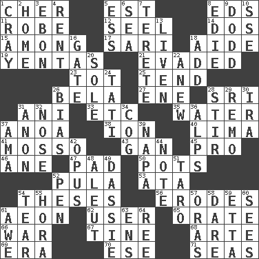 ACROSS 1. "Mermaids" star 5. Eastern Standard Time (abbr.) 8. Begley and Asner 11. Loose flowing garment 12. Sew up the eyelids of hawks and falcons 14. Two (Sp.) 15. Amid 17. Indian skirt 18. Helper 19. Gossips 21. Dodged 23. Small child 25. Watch over 26. Actor Lugosi 27. Compass dir. 28. _ Lanka 31. Black tropical American cuckoo 33. And so on (abbr.) 35. Wetness 37. Small Philippine buffalo 38. Electrically charged atom 40. Pale green bean 41. With motion or animation 43. Separate the seeds from cotton 45. Adept person 46. One (Scot) 47. Groovy apt. 50. Plant holders 52. Monetary unit of Botswana 53. "One Day ___ Time" 54. College papers 56. Eats (away) 61. A really long time 62. One who uses or employs something 65. Speak pompously 66. Armed conflict 67. Prong on a fork 68. Johnson of "Laugh-In" 69. Period 70. Compass dir. 71. Oceans DOWN 1. Supercomputer manufacturer 2. Residence 3. Inky black, to poets 4. Monthly bill 5. Double-curved letter 6. Ocean 7. Cylindrical with tapered ends 8. Singer Brickell 9. Texas town _ City 10. Compass dir. 13. Make or become more lively 16. Yard entry 18. Find the sum of 20. Flatfish 22. Afresh 24. Jacques of French films 26. Prejudice 28. Commotion 29. San ____ (Riviera town) 30. Lyricist Gershwin 31. At once, immediately (arch.) 32. Sense of smell 34. Gear tooth 36. High mountains 37. Housemaid (var.) 39. California wine valley 42. Musical composition 44. Make mention of 48. Native American of Southwest Alaska 49. Small ungulate mammals of Africa 51. Edible starchy tuberous root 52. Fenced enclosure 54. Lacerate 55. Israeli folk dance 57. Mouths or openings 58. Have the gumption 59. Singer James 60. Perceives with the eye 61. Deep reverence 63. Followers of ems 64. To riddle