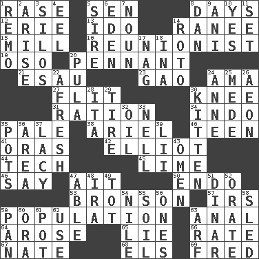 ACROSS 1. To erase 5. Elected rep. 8. 24-hour periods 12. 4th largest of the Great Lakes 13. Wedding promise 14. Indian princess (variant) 15. Place where flour is made 16. One who advocates reunion 19. Bear (Spanish) 20. Pre-World Series prize 21. He sold his birthright 23. E Mali city 24. Wet nurse (var.) 27. Sudden quick movement 30. Leg joint 31. Food allowance for one day 34. Southeast Asian peninsula 35. Diluted with white 38. Satellite of Uranus 40. Adolescent 41. Mouths or openings 42. American author Paul (1891-1958) 44. Technology 45. Welles in "The Third Man" 46. Declare 47. Small island 50. Inside; within (prefix) 53. "Death Wish" actor 57. Big collection agency 59. Census information 63. Of or related to the anus 64. Came up 65. Falsehood 66. Assign a rank or rating to 67. Nathan's nickname 68. Raised railways 69. Flintstone DOWN 1. San ____ (Riviera town) 2. Originate 3. Grain storage towers 4. Snakelike fish 5. Father 6. Locale of original sin 7. Part of speech 8. One of the 12 tribes of Israel 9. Cuckoo 10. It is so 11. Put into a specified state 14. Printing process, for short 17. Tired old horse 18. _ tizzy (2 wds.) 20. Monetary unit of Botswana 22. Anew 24. Queen of England 1702-14 25. Ancient Persian 26. Period of immesurable duration 28. Call ___ day 29. Become fatigued 30. Baby cat 32. Petroleum 33. 1994 drama film starring Jodie Foster 35. Cooking vessels 36. Type of rug 37. Made of lace 39. Cards in a Roman deck? 43. Sign of things to come 47. Competent 48. Lyricist Gershwin 49. Small child 51. Middle Eastern gold or silver currency 52. Speak pompously 54. The longest river in the world 55. Earth 56. Washington bills 58. Downhill vehicle 59. Baking dish 60. Mouth or opening 61. Cooking vessel 62. Purpose 63. Sandy's bark
