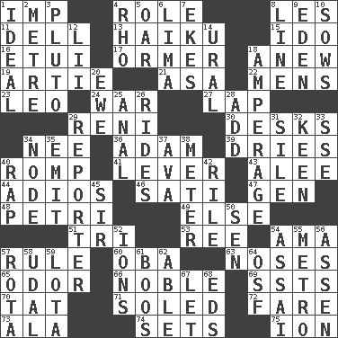 ACROSS 1. Mischievous child 4. Hero or heavy, e.g. 8. French article 11. Small valley 13. Japanese verse 15. Wedding promise 16. Needle case 17. Channel Islands abalone 18. Afresh 19. Nick name for Arthur 21. White ___ sheet 22. Not women's 23. Lion 24. Armed conflict 27. Pet locale 29. Painter Guido (1575-1642) 30. Writing tables 34. Born 36. First of billions? 39. Frees from moisture 40. Play 41. Crowbar 43. Toward shelter 44. Goodbye (Sp.) 46. Suttee (variant) 47. Commissioned military rank (abbr.) 48. _ dish (used to culture cells) 49. Otherwise 51. Three (prefix) 53. Portuguese money of account (variant) 54. Wet nurse (var.) 57. Court order 60. Chief or king in Benin or Nigeria 63. Olfactory organs 65. Scent 66. Impressive in appearance 69. Fast planes 70. Make lace 71. Having a sole or soles 72. Conductor's collection 73. According to 74. Puts into a specified state 75. Electrically charged atom DOWN 1. Standard of perfection 2. Distance measurement (Brit.) 3. Mickey's pet 4. 17th letter of the Greek alphabet 5. Rowing implement 6. Pale green bean 7. Makes supply last 8. Actor's bit 9. Paradise 10. Sty mamas 12. Cards in a Roman deck? 14. Mountain range 18. Electrical Measurement 20. She-sheep 25. Of or related to the anus 26. Amusement-park features 28. Increase 29. News announcer 31. Filth; sediment 32. Peachy ____! 33. Compass dir. 34. Connecting point 35. Give off 37. Actress Gardner 38. Distance measurement 40. Reproach for some lapse or misdeed 42. Cause heat under the collar 45. Title for a knight 50. Elected rep. 52. Charged atoms 54. Slender Brazilian palm 55. Paris' subway 56. NE Netherlands city 57. Round or rotation of duties 58. Hereditary estate 59. Globular water bottle used in Asia 61. Expressions of contempt or scorn 62. Competent 64. Order of Saint Francis (abbr.) 67. Allow 68. Begley and Asner