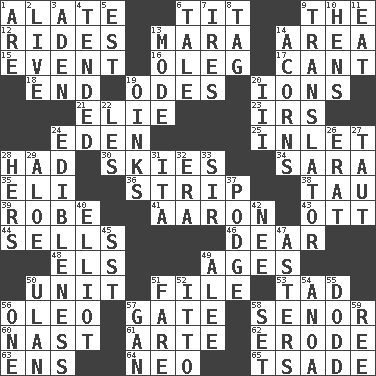 ACROSS 1. Having winglike extensions 6. Teat (slang) 9. Definite Article 12. Amusement-park features 13. Hindu Mythology: god of death 14. Type of rug 15. Happening 16. Cassini of fashion 17. Patter 18. Conclude 19. Lyric poems 20. Charged atoms 21. Writer Wiesel 23. Big collection agency 24. Paradise 25. An arm off of a larger body of water 28. Possessed 30. Atmospheres 34. "Two Mules for Sister ____" 35. Connecticut Ivy Leaguer 36. Long narrow piece of something 38. The 19th letter of the Greek alphabet 39. Loose flowing garment 41. Composer Copland 43. Baseball player Mel 44. Exchanges for money 46. Letter starter 48. Raised railways 49. Matures 50. A single undivided whole 51. Do some clerical work 53. Small amount or degree 56. Margarine 57. Yard entry 58. Sir (Sp.) 60. Political cartoonist Thomas 61. Johnson of "Laugh-In" 62. Wear away 63. Followers of ems 64. Modern: prefix 65. Sadhe (variant) DOWN 1. "We ___ not amused" (Victoria) 2. Moving, as bait 3. Arabian gulf 4. Watched over 5. Eastern Standard Time (abbr.) 6. Lie 7. Angers 8. Label 9. Interpreter 10. Coop moms 11. Erode 13. Method 14. Oak nuts 19. Pig sounds 20. One more than two 22. French article 24. The property of being fit to eat 26. Part of Q.E.F. 27. Drawn tight 28. Possessive pronoun 29. Medicinal plant 31. Call ___ day 32. Epoch 33. Title for a knight 37. Porridge 40. American author Paul (1891-1958) 42. Born 45. Fast jet (abbr.) 47. Michaelmas daisies 49. Toward shelter 50. ____ Bator, Mongolia 51. Conductor's collection 52. "Tell ____ the Marines!" 54. Small Philippine buffalo 55. Texas town _ City 56. Single 57. Separate the seeds from cotton 58. Put into a specified state 59. To sift