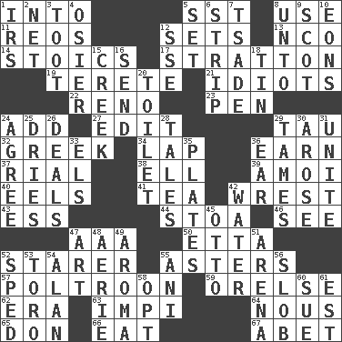 ACROSS 1. To the inside or interior of 5. Fast jet (abbr.) 8. Purpose 11. Vintage cars 12. Puts into a specified state 13. Non-commissioned officer (abbr.) 14. Unemotional ones 17. Ski resort town in Vermont 19. Cigar-shaped 21. Foolish or stupid persons 22. Western Nevada city 23. Fenced enclosure 24. Say or write further 27. Prepare for publication 29. The 19th letter of the Greek alphabet 32. Of Greece 34. Pet locale 36. Merit 37. Monetary unit of Yemen 38. Pipe bend 39. Mine, in Marseilles 40. Snakelike fish 41. Beverage made from leaves 42. Take or capture by force 43. Double-curved letter 44. Portico 46. Perceive with the eye 47. Auto club (abbr.) 50. Singer James 52. A viewer who gazes fixedly 55. Michaelmas daisies 57. Characterized by complete cowardliness 59. Threatening words 62. Period 63. Body of Kaffir warriors 64. Good sense 65. Spanish title 66. Erode 67. Collude with DOWN 1. Big collection agency 2. Fish or hair follower 3. A blast of a horn 4. Flexible twig of a willow tree 5. Arrange properly for use 6. Empty completely 7. Sadhe (variant) 8. To (old English) 9. Native of Scotland 10. Immeasurably long periods of time 12. Compass dir. 15. Small stream 16. Transmit 18. Shallow baking pan 20. Bathroom plumbing fixture 24. Match 25. Frees from moisture 26. Allots cards 28. Falsehoods 29. Softens 30. Came up 31. Join together 33. Raised railways 35. Food holders 36. Hearing organ 42. Wetness 45. Von Bismarck 47. Tate display 48. Nest on high 49. Scent 51. Sports stadium 52. Hurried 53. "Corrida" creature 54. Actor Alda or Thicke 55. Cuckoo 56. Oscar Madison type 58. Elect 60. Institute legal proceedings 61. Eastern Standard Time (abbr.)