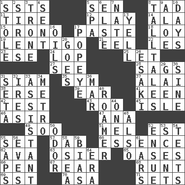 ACROSS 1. Fast planes 5. Elected rep. 8. Small boy 11. Become fatigued 12. Live dramatic performance 14. Wing 15. U. of Maine site 17. Thick mixture 18. Myrna of the movies 19. Small, flat, pigmented spot on the skin 21. Snakelike fish 22. French article 23. Compass dir. 24. Chop off 25. Allow 27. Perceive with the eye 28. Droops 31. Thailand, formerly 35. Symbol (abbr.) 37. Mountain range southwest of Kyrgyzstan 38. Celtic language 39. Hearing organ 41. Peachy ____! 42. Trial 43. Friend of Pooh 45. Capri or Wright 46. SW Saudi Arabia district 47. Santa ___, CA 49. "Barney Miller" actor Jack 51. Cartoonist voice _ Blanc 52. Eastern Standard Time (abbr.) 55. Arrange properly for use 57. Apply (a substance) by light strokes 60. Core 62. Actress Gardner 63. Flexible twig of a willow tree 65. Fertile tracts in a desert 66. Writing instrument 67. Tail end 68. The smallest animal of a litter 69. Fast jet (abbr.) 70. White ___ sheet 71. Arranges properly for use DOWN 1. Took without asking 2. Fathers 3. Marketplace scale 4. Transmitted 5. Health resort 6. Otherwise 7. Nathan's nickname 8. Baron Munchausen's specialties 9. _ vera 10. 24-hour periods 13. Shout 16. Lubricates 17. Wimpy's pal 20. Moves 26. 1973 Nobel Price Winner (Physics) Leo 29. Highlander 30. Trig term 31. Stalk of a moss capsule 32. Angers 33. Aide 34. Paris' subway 36. Third mo. 40. Nomad 44. Singles 48. In addition 50. Scent 52. Follow as a consequence or result 53. Aroma 54. Trials 55. Plant excrements 56. Nights before holidays 58. Toward the sea 59. Prejudice 61. Hearing organs 64. Period