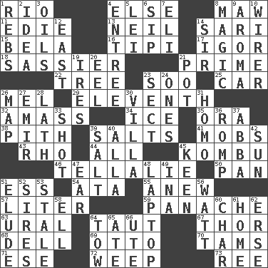 ACROSS 1. _ de Janeiro 4. Otherwise 8. Informal term for the mouth 11. Singer Brickell 13. Famous astronaut Armstrong 14. Indian skirt 15. Actor Lugosi 16. Native american tent (variation) 17. Composer Stravinsky 18. More impudent 21. A-one 22. Woody plant 23. "Barney Miller" actor Jack 25. 4-wheeled motor vehicle 26. Cartoonist voice _ Blanc 29. Veterans Day date 32. Collect or gather 34. Frozen water 35. Mouth or opening 38. Essential or central part 39. Table seasonings 41. Disorderly crowds 43. 17th letter of the Greek alphabet 44. 100% 45. Dried seaweed eaten as food 46. Copy Pinocchio 50. Baking dish 51. Double-curved letter 54. "One Day ___ Time" 55. Afresh 57. 61 cubic inches 59. Flamboyance 63. Mountain range 64. Pulled tight 67. Son of Odin 68. Small valley 69. Von Bismarck 70. Scottish caps 71. Compass dir. 72. Shed a tear 73. To sift DOWN 1. Confederate soldiers (slang) 2. The main thing one is thinking about 3. Lubricates 4. Main course 5. Luau accessory 6. Small drink 7. Biblical high priest 8. Mysterious quality of enchantment 9. Odor 10. One who wires 12. 90 degrees 14. Title for a knight 19. Angers 20. Snakelike fish 21. Plant holder 23. Religious group 24. Singles 26. Atlas unit 27. Independent ruler or chieftain 28. Thin strip of wood or metal 30. Country estate 31. Same (prefix) 33. Went for two points 36. Play 37. Swedish rock group 39. Table seasoning 40. Silent film actress Nazimova 42. Player for Phoenix 45. Peachy ____! 47. Ewer handle 48. Portable computer 49. _ tizzy (2 wds.) 51. Evade 52. Male parents of animals 53. Lacking originality or spontaneity 56. Electrical Unit 58. Pipe bend 60. Burn to charcoal 61. Dwelling 62. Celtic language 64. Pull behind 65. Had dinner 66. Shoshoni