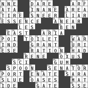 ACROSS 1. Compass dir. 4. Have the gumption 8. Sandy's bark 11. _ moment's notice (2 wds.) 12. Silly 14. Length times width 15. Become fatigued 17. Contemptuous expression 18. One who doesn't tell the truth 19. Core 21. Approach 23. French article 24. Benjamin's nick name 25. 90 degrees 27. Roberta Peters solo 30. Luau course 31. Bathroom plumbing fixture 34. Armed conflict 37. Working for oneself (abbr.) 38. Let have 39. RI univ. 40. Compass dir. 41. Food allowance for one day 43. Possessed 44. French philosopher Descartes 45. Amu Darya 47. _-fi 49. Chewing product 50. Soup utensil 52. Elected representative 56. Left side of a ship or aircraft 57. Maternal 60. "Two Mules for Sister ____" 61. Change direction abruptly 62. Fertile tracts in a desert 63. Floor covering 64. Binary compound 65. Yard entry 66. Compass dir. DOWN 1. Nathan's nickname 2. Nuclear Threat Initiatives 3. Hearing organs 4. Flat circles 5. Queen of England 1702-14 6. Actress Charlotte 7. Compass dir. 8. Believer in; advocate of (suffix) 9. Stern 10. Distant 13. Epoch 14. Toward shelter 16. Snakelike fish 20. Remaining after all deductions 22. Basketball assoc. 25. Immeasurably long periods of time 26. Helper 27. Having winglike extensions 28. Painter Guido (1575-1642) 29. "Tell ____ the Marines!" 30. Sliced dessert 32. Legendary monster 33. SW Asia republic 34. Chinese city south-southwest of Nanjing 35. Caspian sea tributary 36. To free from 42. Part of speech 44. _ de Janeiro 46. Dec. holiday 47. Upset 48. ____ d'Azur (French Riviera) 49. Honkers 50. Disposed of to a purchaser 51. Modern: prefix 52. Proofreading order 53. Scottish caps 54. Mouths or openings 55. Pace 56. 23rd letter of the Greek alphabet 58. Tired old horse 59. White ___ sheet