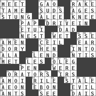 ACROSS 1. Confront 5. E Mali city 8. Libertine 12. Not wild 13. Beer foam 15. Grows older 16. Feeling sharp psychological pain 18. Toward shelter 19. Leg joint 20. Infant food 22. Popular '50s hangout 24. Needle holder 26. June honoree 27. A home for chicks 28. Dripping 29. Compass dir. 32. So be it 35. To provide with a ceiling 37. Hearing organ 38. Dinghy 39. Layer 40. To the inside or interior of 41. Wing 42. Grant temporary use of 43. Nuclear Threat Initiatives 44. Was introduced to 45. French article 46. Cassini of fashion 49. Animal enclosure 50. We are 51. Speakers 55. Big collection agency 56. Mine, in Marseilles 57. Cause heat under the collar 59. Having lost freshness 63. Age 64. Inky black, to poets 65. Tending to cause great harm 66. Pismires 67. Observe 68. Raised platform DOWN 1. Mountains (abbr.) 2. Consume 3. Australian flightless bird 4. 3-inch nail 5. Girls' org. (abbr.) 6. Old (Scot.) 7. Baltic tributary 8. Moved through 9. Hindu god of fire 10. Peachy ____! 11. Compass dir. 14. Beer mug 17. Yard entry 21. Ichor 23. Large container 25. Irritating cutaneous sensations 28. Light entry point 29. Emitted 30. Suttee (variant) 31. Greek god of love 32. First of billions? 33. Undercover agent 34. Part of Q.E.F. 36. Car or cant ending 40. Eaten 42. Poe poem 45. Allow 47. Luau accessory 48. Blunders 49. Aches 51. Sign of something about to happen 52. Carrot, for example 53. Chest bones 54. A type of plum 56. American Automobile Association (abbr.) 58. Compass dir. 60. Actress Gardner 61. Cards in a Roman deck? 62. Raised railways