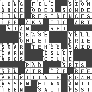 ACROSS 1. Protracted 5. Do some clerical work 9. The Jewish people; Israel 13. Mitch Miller's instrument 14. Wrote a lyric poem 15. Something which is sent 16. Actor's bit 17. Homes 19. Area sheltered from the wind 20. Alias (abbr.) 21. Nervous spasm 22. Nonscientific branch of learning 23. Comedian Laurel of Laurel & Hardy 25. Put into a specified state 26. Desist 30. Shout 34. A small or young owl 35. 4th largest of the Great Lakes 36. Fly high 39. Giggle 42. Alleged 43. Merit 44. Small island 46. Arches 47. Cell (Danish) 48. Writing tablet 51. Indian titles of respect 54. Elected rep. 57. Wind 58. Frozen water 60. To riddle 62. Appease 65. Wander 66. NE Netherlands city 67. Style 68. Against 69. Adolescent 70. Table seasoning 71. Inconspicuous attention getter DOWN 1. Hang loosely or laxly 2. Off-Broadway awards 3. Music written for nine 4. Unit of force equal to gravity 5. Tined utensil 6. The content of cognition 7. French article 8. Proofreads 9. Manchild 10. South American Indian 11. Baltic tributary 12. A home for chicks 15. Religious group 18. Expire 20. Afresh 24. Oak nuts 27. Keyboard modifier key 28. Perceive with the eye 29. Principle of right and wrong 30. Of or pertaining to yesterday 31. Period 32. Cards in a Roman deck? 33. Directed 36. Ocean 37. Rowing implement 38. Curve 40. Compass dir. 41. Pipe bend 45. Otherwise 48. Ache 49. Small island 50. Frees from moisture 52. Metal shackles 53. Theater features 54. Argument over a trivial matter 55. Celtic language 56. Sense of smell 58. Slanted text style (abbr.) 59. Penny 61. Send forth 63. Writing instrument 64. Wing 65. Hit sharply and swiftly