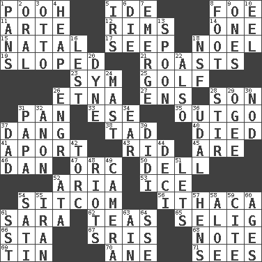 ACROSS 1. "Silly old bear" 5. Binary compound 8. Enemy 11. Johnson of "Laugh-In" 12. Basketball hoops 14. Single 15. Relating to or accompanying birth 17. Ooze 18. Christmas carol 19. Slanted 21. Ridicules or criticizes harshly 23. Symbol (abbr.) 25. Eighteen holes 26. Inactive volcano in Sicily 27. Followers of ems 28. Male child 31. Baking dish 33. Compass dir. 35. Outlay 37. Mild oath, euphamism for damn 38. Bit 40. Passed on 41. To the left, to Queeg 43. To free from 45. "We ___ not amused" (Victoria) 46. Daniel's nick name 47. The grampus (Milton) 50. Small valley 52. Operatic vocal solo 53. Frozen water 54. "Cheers" or "Ellen" 56. New York city 61. "Two Mules for Sister ____" 62. Afternoon social gatherings 65. Major League Baseball Commissioner Bud 66. R.R. building 67. Indian titles of respect 68. Musical sound 69. Metal container 70. A saturated hydrocarbon 71. Observes DOWN 1. Zero-star reviews 2. Of the mouth 3. "Beetle Bailey" pooch 4. Pile 5. Big collection agency 6. Expire 7. Develop 8. Lowest support of a structure 9. Washington bills 10. Snakelike fish 13. Soup utensil 16. For fear that 18. Science/research agcy. 20. Unit of force 22. In addition 24. Vertical spar for supporting sails 26. Engineer (abbr.) 28. Tumult 29. Double curve, resembling the letter S 30. Allow head to fall sleepily 31. Dad 32. Soon (poet.) 34. Ewer handle 36. Allodial 37. Male parent 39. "You Light Up My Life" star Conn 42. Torque (variant) 44. Tenth: prefix 48. Disturbances 49. Device for capturing images 51. Allows 52. _ moment's notice (2 wds.) 54. Suttee (variant) 55. SW Asia republic 57. Coop moms 58. _ vera 59. Quote 60. Eras 61. Fast jet (abbr.) 63. The 18th letter of the Arabic alphabet 64. Compass dir.