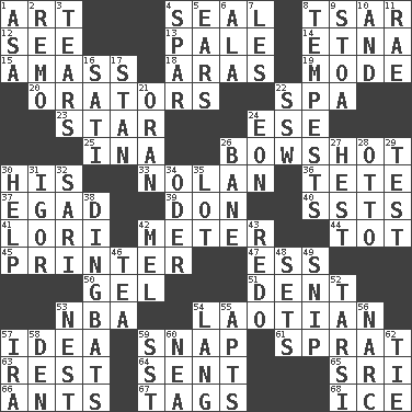 ACROSS 1. Tate display 4. Lick closed 8. Russian ruler of old 12. Observe 13. Diluted with white 14. Inactive volcano in Sicily 15. Collect or gather 18. Caspian sea tributary 19. Method 20. Speakers 22. Health resort 23. Play the lead 24. Compass dir. 25. _ tizzy (2 wds.) 26. The distance a bow sends an arrow 30. Part of HMS, perhaps 33. Pitcher Ryan 36. Wig 37. Mild oath 39. Spanish title 40. Fast planes 41. Australian parrot (variant) 42. Distance measurement 44. Small child 45. Hard copy producer 47. Double-curved letter 50. Set 51. Scratch 53. Basketball assoc. 54. Of or relating to Laos or its people 57. The content of cognition 59. Fastener 61. Small fatty European fish 63. State of inaction 64. Emitted 65. Indian title of respect (Mr.) 66. Pismires 67. Labels 68. Frozen water DOWN 1. White ___ sheet 2. San ____ (Riviera town) 3. Separates forcefully 4. Practice fight 5. Hearing organs 6. Chicken ___ king 7. French article 8. Storms 9. Portico 10. Added to 11. Actress Charlotte 16. Suttee (variant) 17. Comedian Laurel of Laurel & Hardy 21. NW Algerian seaport 22. Compass dir. 24. A really long time 26. Object of repulsion 27. Command 28. Von Bismarck 29. Trial 30. Aid 31. Composer Stravinsky 32. Indian skirt 34. River in Europe 35. Car dealer's back yard 38. Empty-headed or silly people 42. Cartoonist voice _ Blanc 43. Make new 46. Beverage made from leaves 48. Arranges properly for use 49. Clip 52. Tarsus (plural) 53. A home for chicks 54. Long (Scottish) 55. Tenement units (abbr.) 56. Drug cop 57. Retirement account (abbr.) 58. Lair 59. Fast jet (abbr.) 60. Teachers' org. 62. Standoff