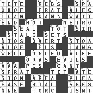 ACROSS 1. False hair 5. Confederate soldiers (slang) 9. Health resort 12. Mitch Miller's instrument 13. Part of Q.E.F. 14. Actor Baldwin 15. Grant temporary use of 16. Nanny 17. Electrical Unit 18. Conclude 19. Being at a high temperature 21. Paris' subway 22. Lick closed 24. Small child 26. Title for a knight 27. Lacking originality or spontaneity 28. Arranges properly for use 29. "Vaya con ____" 30. Unconcealed 32. Portico 36. _ vera 37. Raised railways 38. Long (Scottish) 39. Not ill 40. Stared at amorously 42. Toward shelter 43. Mouths or openings 44. Vices 46. American Automobile Association (abbr.) 49. Personal Computers (abbr.) 50. Patter 51. Small fatty European fish 53. Teat (slang) 54. Had dinner 57. The Jewish people; Israel 58. Length times width 61. Entreaty 62. Relaxation 63. Monetary unit of Yemen 64. Perceives with the eye 65. Compass dir. 66. Torque (variant) 67. Is not DOWN 1. Lacquered or enameled metalware 2. Inky black, to poets 3. Inedible or poisonous agaric 4. Car or cant ending 5. Monthly bill 6. Period 7. Prohibit 8. R.R. building 9. Narrow boards 10. _ dish (used to culture cells) 11. Thespian 14. Deep reverence 19. Actor Linden 20. Margarine 21. Mountains (abbr.) 23. Artist's stand 24. Laconic 25. Baseball player Mel 27. Filth; sediment 28. Exchanges for money 29. Simpleton 31. Viva Las _ 32. Killed 33. Baron Munchausen's specialties 34. Singles 35. Ripen 40. The grampus (Milton) 41. Tenth: prefix 43. Choose 45. Large container 46. NE Netherlands city 47. Bee-related 48. Came up 52. A saturated hydrocarbon 53. Baby powder 55. Adolescent 56. 90 degrees 58. Nonscientific branch of learning 59. River (Sp.) 60. Ewer handle 61. Air pressure measure (abbr.)