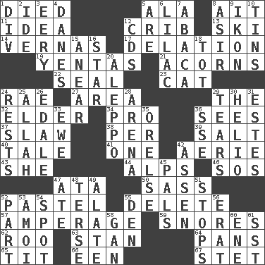 ACROSS 1. Passed on 5. Insect wing 8. Small island 11. The content of cognition 12. Baby bed with high sides 13. What Jean-Claude Killy likes to do 14. Actresses Bloom and Felton 17. Conveyance 19. Gossips 21. Oak nuts 22. Lick closed 23. Domesticated feline 24. Actress Charlotte 27. Type of rug 29. Definite Article 32. A person who is older than you are 34. Adept person 36. Observes 37. Cole _ (cabbage dish) 38. For each 39. Table seasoning 40. Story 41. Single 42. Nest on high 43. A female animal or person 44. High mountains 46. Mayday 47. _ moment's notice (2 wds.) 50. Backtalk 52. Soft color 55. Keyboard key 57. Electrical Measurement 59. Sounds asleep 62. Friend of Pooh 63. Comedian Laurel of Laurel & Hardy 64. Zero-star reviews 65. Teat (slang) 66. Car or cant ending 67. Proofreading order DOWN 1. HTML Container Element 2. Binary compound 3. Suggestive of the supernatural 4. Natives or inhabitants of Denmark 5. "We ___ not amused" (Victoria) 6. Pale purple color 7. Phillipine bananalike plant 8. SW Saudi Arabia district 9. Visual representation of an object 10. Airtight sealed metal containers 12. Music discs 15. Approach 16. Play the lead 18. Small child 20. City in Syria 24. Musical pauses 25. Assad's deity 26. Peak District village in England 28. Sports stadium 29. Separates forcefully 30. Sun: prefix 31. _____ Park, CO 33. She-sheep 35. Threatening words 36. Compass dir. 42. NE Netherlands city 45. Friends 47. Had dinner 48. Laconic 49. Having winglike extensions 51. Discontinues 52. Role in a play 53. Mine, in Marseilles 54. Specific locale 55. Lair 56. Part of Q.E.F. 58. Separate the seeds from cotton 60. Compass dir. 61. Fast jet (abbr.)