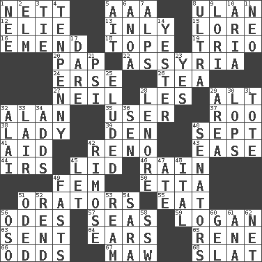 ACROSS 1. Remaining after all deductions 5. American Automobile Association (abbr.) 8. ____ Bator 12. Writer Wiesel 13. Inwardly 15. Old wives' tales, e.g. 16. Make improvements or corrections to 18. Drink excessively 19. Musical group of three 20. Infant food 22. Nineveh was its capital 24. Celtic language 26. Beverage made from leaves 27. Famous astronaut Armstrong 28. French article 29. Keyboard modifier key 32. Actor Alda or Thicke 35. One who makes use of a thing 37. Friend of Pooh 38. Kenny Rogers chart-topper in '80 39. Lair 40. Back-to-school mo. 41. Assist 42. Western Nevada city 43. Comfort 44. Big collection agency 45. Flaplike covering 46. Precipitation 49. Opposite of masc. 50. Singer James 51. Speakers 55. Consume 56. Lyric poems 57. Oceans 59. Utah city north of Ogden 63. Posted 64. Hearing organs 65. French philosopher Descartes 66. Likelihood 67. Informal term for the mouth 68. Narrow board DOWN 1. Born 2. Shade tree 3. Neckwear 4. 3-inch nail 5. Small island 6. Small Philippine buffalo 7. High mountains 8. Extremist 9. Australian parrot (variant) 10. Roberta Peters solo 11. Modern: prefix 14. Next before 17. Have the gumption 21. Air pressure measure (abbr.) 23. Affirmative reply 25. Evaded 28. Poe poem 29. Length times width 30. Chops off 31. Carryall 32. Jai _ 33. Den 34. Does sums 36. Elected rep. 40. Legislators 42. Full of chinks, cracks, or crevices 45. Allow 47. Had dinner 48. Slanted text style (abbr.) 49. Goes without food and/or water 51. Wrote a lyric poem 52. Tear apart 53. 480, 500 or 516 sheets of paper 54. "Two Mules for Sister ____" 56. Bear (Spanish) 58. Compass dir. 60. Set 61. Santa ___, CA 62. Fish or hair follower