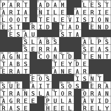 ACROSS 1. Piece 5. First man 9. For fear that 13. Roberta Peters solo 14. The longest river in the world 15. Nest on high 16. Spoils 17. Boob tube 19. Eastern Standard Time (abbr.) 20. To free from 21. Small amount or degree 22. Conclusion 23. Son of Isaac 25. R.R. building 26. Thick slices 30. High mountains 34. Spanish missionary in California 35. Oceans 36. Hindu god of fire 39. Continued (abbr.) 42. Portable shelter 43. Bar bills 44. Miss Universe 1986, Barbara Palacios _ 46. Part of Q.E.F. 47. Approach 48. Greek goddess of the dawn 51. Is not 54. Institute legal proceedings 57. Small island 58. Mayday 60. Period 62. Interpreter 65. NW Algerian seaport 66. Match 67. Monetary unit of Botswana 68. Enthusiastic 69. To erase 70. The bottom of a shoe or boot 71. Trust DOWN 1. Diluted with white 2. Came up 3. Disturbances 4. Make lace 5. Opposed to 6. Passed on 7. Everything 8. Confronts 9. French article 10. 4th largest of the Great Lakes 11. The Jewish people; Israel 12. Watch over 15. Opera by Verdi 18. Large container 20. Governing power 24. Help 27. Curve 28. Sis' sibling 29. Before Barbara or Clara 30. Michaelmas daisies 31. Area sheltered from the wind 32. Baking dish 33. Fast jet (abbr.) 36. Had dinner 37. Slender fish 38. Basketball assoc. 40. Nine, plus one 41. Color 45. Raised platform 48. Relaxation 49. Lubricate 50. Staphylococcus 52. Effrontery 53. Hang back 54. Play the lead 55. Capital and largest city of Mongolia 56. Hearing organs 58. Flatfish 59. Relating to the mouth 61. "60 Minutes" Commentator Rooney 63. Born 64. Third day of the wk. 65. Rowing implement