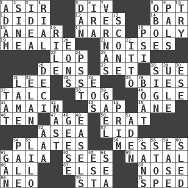 ACROSS 1. SW Saudi Arabia district 5. HTML Container Element 8. Elect 11. "You Light Up My Life" star Conn 12. Ancient Greek god of war 14. Drinking establishment 15. Approach 17. Drug cop 18. Much (prefix) 19. Ear of corn 21. Annoying sounds 23. Trim (branches) 25. Opposed to 26. Hiding places for outlaws 27. Put into a specified state 28. Take to court 31. Area sheltered from the wind 33. Compass dir. 35. Off-Broadway awards 37. Baby powder 38. Coat; cloak 40. Stare 41. With great haste 43. Plant excrement 45. One (Scot) 46. Nine, plus one 47. Grow older 50. Part of Q.E.F. 52. Toward the sea 53. Hat (slang) 54. Food holders 56. Makes clutter 61. Greek goddess of the earth (variant) 62. Observes 65. Relating to or accompanying birth 66. 100% 67. Otherwise 68. Characteristic smell of wine 69. Modern: prefix 70. R.R. building 71. Hurried DOWN 1. First of billions? 2. Trig term 3. It may be bright or harebrained 4. Monetary unit of Yemen 5. One of the 12 tribes of Israel 6. Lyricist Gershwin 7. Actresses Bloom and Felton 8. Mitch Miller's instrument 9. Friends 10. Attempt to accomplish something 13. Biscuitlike quick bread 16. Cause heat under the collar 18. Air pressure measure (abbr.) 20. Immeasurably long periods of time 22. "Tell ____ the Marines!" 24. Inconspicuous attention getter 26. Tenth: prefix 28. Attach a signature 29. Ubangi River tributary 30. Compass dir. 31. Unable to walk 32. Flair 34. Greek goddess of the dawn 36. Water vessel 37. Make lace 39. Highlander 42. Political cartoonist Thomas 44. Demure 48. Honkers 49. Artist's stands 51. Arabian gulf 52. Auto club (abbr.) 54. Light colored 55. _ and Stitch 57. Without 58. Obstruct or block passage 59. Comfort 60. Downhill vehicle 61. Separate the seeds from cotton 63. Eastern Standard Time (abbr.) 64. Ocean