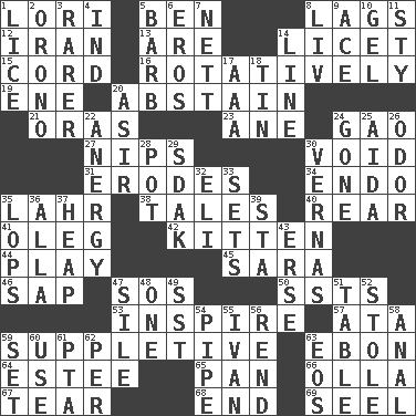 ACROSS 1. Australian parrot (variant) 5. Benjamin's nick name 8. Fails to keep up a pace 12. SW Asia republic 13. "We ___ not amused" (Victoria) 14. It is permitted: Lat. 15. Drawstring 16. Rotating or pertaining to rotation 19. Compass dir. 20. Choose not to consume 21. Mouths or openings 23. A saturated hydrocarbon 24. E Mali city 27. Pinches, bites 30. Null 31. Eats (away) 34. Inside; within (prefix) 35. Cowardly lion portrayer 38. Falsehoods 40. Bring up, as a child 41. Cassini of fashion 42. Baby cat 44. Romp 45. "Two Mules for Sister ____" 46. Plant excrement 47. Mayday 50. Fast planes 53. Motivate 57. _ moment's notice (2 wds.) 59. Supplementary 63. Inky black, to poets 64. First name in cosmetics 65. Baking dish 66. Water jar 67. Pull into pieces 68. Conclude 69. Sew up the eyelids of hawks and falcons DOWN 1. Louse (plural) 2. U. of Maine site 3. More valued for its uncommonness 4. Working for oneself (abbr.) 5. Sharp remark 6. Greek god of love 7. Remaining after all deductions 8. 54 in ancient Rome 9. Adept person 10. Set 11. Filthy place 14. Actor's bit 17. American Automobile Association (abbr.) 18. Shallow baking pan 20. SW Saudi Arabia district 22. Disorder of the immune system 24. Went 25. Opera by Verdi 26. Scent 28. Plant holder 29. Neighbor of Neb. 30. Actresses Bloom and Felton 32. Connecticut Ivy Leaguer 33. Arranges properly for use 35. Chops off 36. Silent film actress Nazimova 37. Pile 39. R.R. building 43. Celtic language 47. Drop; flow; fall 48. Single 49. Fast jet (abbr.) 51. Eating place 52. Fur scarf 54. Corncob 55. _ the terrible 56. Tear apart 58. Of or related to the anus 59. Arrange properly for use 60. Purpose 61. Parent Teacher Association (abbr.) 62. For each 63. Greek goddess of the dawn