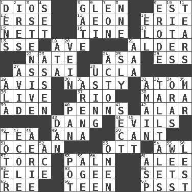 ACROSS 1. "Vaya con ____" 5. Small, secluded valley 9. Eastern Standard Time (abbr.) 12. Celtic language 13. A really long time 14. One of the Great Lakes 15. Remaining after all deductions 16. Prong on a fork 17. Globular water bottle used in Asia 18. Compass dir. 19. "___ Maria" 21. Tree or shrub in the Birch family 22. Nathan's nickname 24. White ___ sheet 26. Curvy letter 27. Slender Brazilian palm 28. Southern CA. univ. 29. Advice 30. Thoroughly unpleasant 32. Smallest unit of an element 36. Moving, as bait 37. River (Sp.) 38. Hindu Mythology: god of death 39. Arabian gulf 40. Actor Sean's family 42. Having or resembling wings 43. Mild oath, euphamism for damn 44. Vices 46. Afternoon social gathering 49. Santa ___, CA 50. Patter 51. Sea 53. Baseball player Mel 54. Leather borer 57. Torque (variant) 58. Inside of hand 61. Toward shelter 62. Writer Wiesel 63. Double curve, resembling the letter S 64. Puts into a specified state 65. Portuguese money of account (variant) 66. Adolescent 67. Inconspicuous attention getter DOWN 1. Hiding places for outlaws 2. Angers 3. Clearly or manifestly demonstrative 4. Put into a specified state 5. Yard entry 6. Flowery wreath 7. Age 8. Compass dir. 9. Wear away 10. Locates 11. Rends 14. Pipe bend 19. _ moment's notice (2 wds.) 20. Distinctive style or manner 21. Auto club (abbr.) 23. NE Netherlands city 24. 13-14th century defensive garment 25. Cunning 27. Enthusiastic 28. Putting into practice 29. Chicken ___ king 31. Sports stadium 32. With great haste 33. Baron Munchausen's specialties 34. Mouths or openings 35. Third mo. 40. Baking dish 41. Religious group 43. Daniel's nick name 45. Large container 46. Carrier 47. Learning spot: Fr. 48. Nest on high 52. Adept person 53. Presage 55. Soaks 56. For fear that 58. Plant holder 59. Mature 60. Area sheltered from the wind 61. Viper
