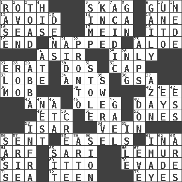 ACROSS 1. Writer of Portnoy's Complaint (1969) 5. Heroin 9. Chewing product 12. Prevent the occurrence of 14. South American Indian 15. A saturated hydrocarbon 16. Gospel singer Marvin 17. Chow _ 18. It would 19. Conclude 20. Slept 23. _ vera 24. SW Saudi Arabia district 25. Inwardly 27. Part of Q.E.F. 30. Two (Sp.) 32. Head covering 33. Ear part 34. Pismires 36. Girls' org. (abbr.) 38. Crowd into 39. Pull behind 40. Last letter of the English alphabet 43. Santa ___, CA 46. Cassini of fashion 48. 24-hour periods 49. And so on (abbr.) 51. Epoch 52. Singles 53. Austrian river, tributary to the Danube 54. Distinctive style or manner 56. Posted 58. Artist's stands 61. _ tizzy (2 wds.) 64. Sandy's bark 65. Indian skirt 66. Arboreal primate 68. Title for a knight 69. "Tell ____ the Marines!" 70. Dodge 71. Ocean 72. Adolescent 73. Sight organs DOWN 1. To erase 2. Baking chamber 3. Frog relative 4. Part of HMS, perhaps 5. Simple or foolish person 6. Leg joint 7. Being or containing an acid 8. Separate the seeds from cotton 9. Lightheartedly 10. To (old English) 11. Ancient Persian 13. Habitations of wild animals 21. Opera by Verdi 22. Right away 23. High mountains 24. Had dinner 26. Tired old horse 27. Shade tree 28. Friend of Pooh 29. Swedish rock group 31. Fur scarf 35. Turn aside suddenly 37. Muslim summons to prayer 41. Sight organ 42. Curvy letter 44. A home for chicks 45. _ moment's notice (2 wds.) 47. Highlander 48. Spanish title 50. Make 53. Kind of red light 55. Capri or Wright 56. Backtalk 57. One of the Great Lakes 59. Johnson of "Laugh-In" 60. The Jewish people; Israel 61. "If ____ say so..." 62. Naked 63. Ancient Greek god of war 65. Be seated 67. Night before a holiday