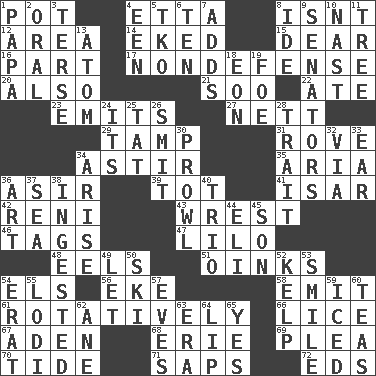 ACROSS 1. Plant holder 4. Singer James 8. Is not 12. Type of rug 14. Supplemented with great effort 15. Letter starter 16. Piece 17. Unrelated to defense, as in spending 20. In addition 21. "Barney Miller" actor Jack 22. Had dinner 23. Sends forth 27. Remaining after all deductions 29. Pack (down) 31. Be footloose 34. Having gotten out of bed 35. Operatic vocal solo 36. SW Saudi Arabia district 39. Small child 41. Austrian river, tributary to the Danube 42. Painter Guido (1575-1642) 43. Obtain by seizing forcibly or violently 46. Labels 47. _ and Stitch 48. Snakelike fish 51. Pig sounds 54. Raised railways 56. Make supply last 58. Give off 61. Rotating or pertaining to rotation 66. Louse (plural) 67. An important port of Yemen 68. 4th largest of the Great Lakes 69. Entreaty 70. Periodic rise and fall of the sea level 71. Plant excrements 72. Begley and Asner DOWN 1. Dad 2. Relating to the mouth 3. Laconic 4. Car or cant ending 5. Ring climax 6. "___ Little Indians" 7. Sums up 8. Binary compound 9. Elected representatives 10. Political cartoonist Thomas 11. Family _ (genealogy) 13. Tiny particle 18. Age 19. Enemy 24. It is 25. Make lace 26. Stricken, poetically 28. Distinguishing feature 30. Move like a hungry wolf 32. By way of 33. Ewer handle 34. Originate 36. Tate display 37. Ocean 38. Consumed 40. Musical group of three 44. Biblical high priest 45. Male offspring 49. Allow 50. What Jean-Claude Killy likes to do 52. Seaweed 53. Grin 54. Part of Q.E.F. 55. Farming town in central California 57. Nights before holidays 59. On the rocks 60. Afternoon social gatherings 62. One (Scot) 63. Period 64. Mouth edge 65. Consenting reply