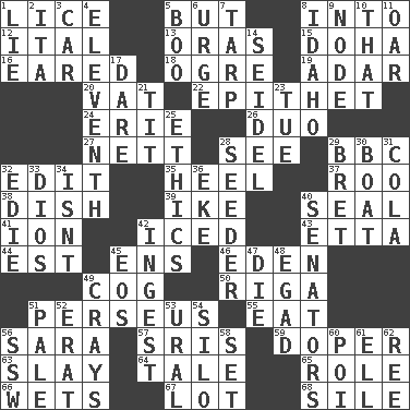 ACROSS 1. Louse (plural) 5. Yet 8. To the inside or interior of 12. Slanted text style (abbr.) 13. Mouths or openings 15. Capital of the state of Qatar 16. Having ears or earlike features 18. Legendary monster 19. The sixth month of the Jewish calendar 20. Large container 22. Curse 24. 4th largest of the Great Lakes 26. Superhero pair 27. Remaining after all deductions 28. Observe 29. English channel? 32. Prepare for publication 35. The bottom of a shoe or boot 37. Friend of Pooh 38. Food container 39. Mamie's husband 40. Lick closed 41. Electrically charged atom 42. On the rocks 43. Singer James 44. Eastern Standard Time (abbr.) 45. Followers of ems 46. Locale of original sin 49. Gear tooth 50. Port city in Latvia 51. Son of Zeus who helped slay Medusa 55. Consume 56. "Two Mules for Sister ____" 57. Indian titles of respect 59. Drug addict 63. Kill 64. Falsehood 65. Hero or heavy, e.g. 66. Soaks 67. Car dealer's back yard 68. Filth; sediment DOWN 1. Falsehood 2. Call ___ day 3. Auto 4. Veterans Day date 5. Surprise greeting 6. Goad 7. Canvas cover 8. Potato state 9. Thickened enlargement 10. Not this but _ 11. Rowing implement 14. A glass for beer 17. Have the gumption 21. Teat (slang) 23. Third day of the wk. 25. Principles of right and wrong 28. Sowing specialist 29. Cy Young winner Saberhagen 30. Water vessel 31. Root beer relative 32. Singer Brickell 33. "Vaya con ____" 34. Is not 36. Make supply last 40. Elected representatives 42. Eat 45. Greek goddess of the dawn 47. Pass on 48. Mild oath 49. Trading vessels 51. Diluted with white 52. Part of Q.E.F. 53. Mountain range 54. Grain storage tower 56. Compass dir. 58. Arrange properly for use 60. Luau course 61. Pipe bend 62. Portuguese money of account (variant)