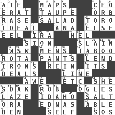 ACROSS 1. Had dinner 4. Atlas contents 8. Corporate head (abbr.) 11. Part of Q.E.F. 13. Grayish beige 15. Globe 16. To erase 17. Vegetable dish 18. "Corrida" creature 19. Standard of perfection 21. Santa ___, CA 22. Otherwise 23. Snakelike fish 24. Retirement account (abbr.) 27. Cartoonist voice _ Blanc 29. The Jewish people; Israel 30. Killed 34. Compass dir. 36. Not women's 39. Off limits 40. Round or rotation of duties 41. Leg coverings 43. Grant temporary use of 44. Removes the wrinkles 46. It's straight from the horse's mouth 47. ___ a Wonderful Life 48. Allots cards 49. Actor's bit 51. Deep reverence 53. And so on (abbr.) 54. A female animal or person 57. Neighbor of Neb. 60. Director Reiner 63. Stares at amorously 65. Goldbrick 66. Potato state 69. Table seasoning 70. Mouth or opening 71. Ferber et al. 72. Competent 73. Benjamin's nick name 74. Automatically 75. Mayday DOWN 1. Nest on high 2. Barter 3. Artist's stand 4. Mountains (abbr.) 5. American Automobile Association (abbr.) 6. Monetary unit of Botswana 7. Connect, as a bridge 8. Calm and collected 9. Blunders 10. Mitch Miller's instrument 12. Beverage made from leaves 14. Dutch treat 18. Copy Pinocchio 20. Cards in a Roman deck? 25. Play 26. Approach 28. Eastern Standard Time (abbr.) 29. Tchaikovsky ballet 31. Collude with 32. Charged atoms 33. Lower and raise head in agreement 34. Had on 35. Portico 37. Compass dir. 38. Vertical member of a panel or frame 40. To free from 42. In a ____ (agitated or irritated) 45. Compass dir. 50. Non-commissioned officer (abbr.) 52. 4th largest of the Great Lakes 54. Thick slices 55. Phone greeting 56. _____ Park, CO 57. Messy guy 58. Have the gumption 59. Muslim summons to prayer 61. Probability 62. Object of repulsion 64. Girls' org. (abbr.) 67. Actor Linden 68. Order of Saint Francis (abbr.)
