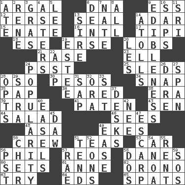ACROSS 1. Therefore, facetiously 6. Heredity factor (abbr.) 9. Double-curved letter 12. Laconic 13. Lick closed 14. The sixth month of the Jewish calendar 15. Maternal 16. International (abbr.) 17. Native american tent (variation) 18. Compass dir. 19. Celtic language 20. Tennis shots 21. To erase 23. Pipe bend 24. Inconspicuous attention getter 25. Bobsleighs 28. Bear (Spanish) 30. Mexican monetary units 34. Fastener 35. Infant food 36. Having ears or earlike features 38. Period 39. Loyal 41. Eucharist need 43. Elected rep. 44. First course 46. Observes 48. White ___ sheet 49. Supplements with great effort 50. Ship's personnel 51. Afternoon social gatherings 53. Auto 56. Silvers or Donahue 57. Vintage cars 58. Natives or inhabitants of Denmark 60. Arranges properly for use 61. Queen of England 1702-14 62. U. of Maine site 63. Attempt to accomplish something 64. Begley and Asner 65. Arguments over trivial matters DOWN 1. Had dinner 2. French philosopher Descartes 3. Pate de foie ____ 4. Michaelmas daisies 5. Area sheltered from the wind 6. Lairs 7. Nathan's nickname 8. 100% 9. The property of being fit to eat 10. Plant excrements 11. Indian title of respect (Mr.) 13. Male parent of an animal 14. Ringlike coral islands and reefs 19. First name in cosmetics 20. French article 22. Cleo's killer 24. Teen's desire 26. Have the gumption 27. Connect, as a bridge 28. Elects 29. "Two Mules for Sister ____" 31. Plant excrement 32. Mouth or opening 33. Put into a specified state 37. Writing tables 40. Artist's stands 42. Born 45. Simpleton 47. Fortification 49. Relaxation 50. "Mermaids" star 51. Be inclined (to) 52. Immeasurably long periods of time 54. Small Philippine buffalo 55. Monthly bill 56. Pacific Standard Time (abbr.) 57. Actress Charlotte 58. Two (Sp.) 59. Distress signal