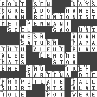 ACROSS 1. Carrot, for example 5. Elected rep. 8. 24-hour periods 12. Legendary monster 13. Wedding promise 14. Indian princess (variant) 15. Actor Alda or Thicke 16. One who advocates reunion 19. Was introduced to 20. Pre-World Series prize 21. Stitch closed the eyes of (a falcon) 23. E Mali city 24. Single; one (prefix) 27. Delicate 30. First of billions? 31. Titan orbits this 34. Dad 35. Ballerina skirt 38. Native American of Southwest Alaska 40. Live dramatic performance 41. Toward shelter 42. Poe poem 44. Floor protectors 45. Portico 46. Compass dir. 47. Australian flightless bird 50. Unclean, religiously 53. Chrissie's court nemesis 57. Expire 59. Appease 63. Promenade 64. Chest covering 65. Mountains (abbr.) 66. Mountain range southwest of Kyrgyzstan 67. Lacquered or enameled metalware 68. Plant holder 69. Past tense of be (plural) DOWN 1. Wander aimlessly 2. Stares 3. Speak pompously 4. "___ Little Indians" 5. Male parent of an animal 6. Genesis locale 7. Part of speech 8. One of the 12 tribes of Israel 9. Cuckoo 10. Affirmative reply 11. Put into a specified state 14. Printing process, for short 17. Tired old horse 18. _ tizzy (2 wds.) 20. Entreaty 22. Takes place subsequently 24. Hereditary estate 25. California wine valley 26. "If ____ say so..." 28. R.R. building 29. Frame or body of a ship 30. Become visible 32. To separate or throw off 33. Religious women 35. Not wild 36. ____ Bator 37. False hair 39. Small child 43. Roll call or roster of names 47. Send forth 48. Floor protector 49. RI univ. 51. Peak District village in England 52. Of or pertaining to a thread or threads 54. Pack (down) 55. "Tell ____ the Marines!" 56. A home for chicks 58. Writer Wiesel 59. Pacific Standard Time (abbr.) 60. 17th letter of the Greek alphabet 61. Lubricate 62. Before (prefix) 63. Informal term for the mouth