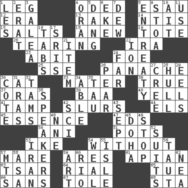 ACROSS 1. Part of a journey 4. Wrote a lyric poem 8. Son of Isaac 12. Epoch 13. Libertine 14. Nuclear Threat Initiatives 15. Table seasonings 18. Afresh 19. Carryall 20. Lacerating 22. Retirement account (abbr.) 23. "This won't hurt ____!" 24. Enemy 25. Compass dir. 26. Flamboyance 30. Domesticated feline 33. Mother 36. Loyal 37. Mouths or openings 39. Sound made by sheep 40. Shout 41. Pack (down) 42. Plays smoothly or legato 44. Raised railways 45. Substance 47. Begley and Asner 50. Black tropical American cuckoo 51. Plant holders 53. Mamie's mate 54. Sans 57. Female horse 59. Ancient Greek god of war 61. Bee-related 63. Russian ruler of old 64. Monetary unit of Yemen 65. Third day of the wk. 66. Without 67. Lacquered or enameled metalware 68. R.R. building DOWN 1. French article 2. Part of Q.E.F. 3. An organ shaped like a helmet 4. NW Algerian seaport 5. Mild oath, euphamism for damn 6. Supplement with great effort 7. Morning condensation 8. Plea 9. Portico 10. Small island 11. Purpose 16. Bar bills 17. Indian titles of respect 21. A distinct part 22. Electrically charged atom 24. At a great distance 26. Lightbulb-shaped fruit 27. Algonquian 28. Frame or body of a ship 29. Snakelike fish 30. ____ d'Azur (French Riviera) 31. Ancient river in northeast Turkey 32. Scottish caps 34. Competent 35. The 19th letter of the Greek alphabet 38. Orators 42. _-fi 43. Back-to-school mo. 46. Compass dir. 48. Capital of the state of Qatar 49. Constrict 52. Sets of matching outer garments 53. SW Asia republic 54. Welt 55. Capri or Wright 56. Drawn tight 57. Mountains (abbr.) 58. White ___ sheet 59. Nonscientific branch of learning 60. _ de Janeiro 62. Teachers' org.