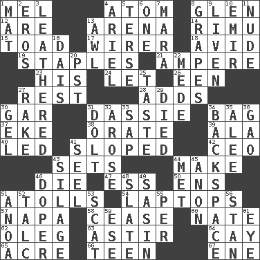 ACROSS 1. Cartoonist voice _ Blanc 4. Tiny particle 8. Small, secluded valley 12. "We ___ not amused" (Victoria) 13. Sports stadium 14. Tall New Zealand timber tree 15. Frog relative 17. One who wires 18. Enthusiastic 19. Paper fasteners 21. Electrical Unit 23. Part of HMS, perhaps 24. Allow 26. Car or cant ending 27. Respite 28. Does sums 30. Slender fish 31. Hyrax 34. Paper or plastic container 37. Supplement with great effort 38. Declaim 39. According to 40. Directed 41. Slanted 42. Corporate head (abbr.) 43. Puts into a specified state 44. Cause to be 46. Pass on 47. Double-curved letter 50. Followers of ems 51. Ringlike coral islands and reefs 54. Portable computers 57. California wine valley 58. Desist 60. Nathan's nickname 62. Cassini of fashion 63. Moving about 64. Island 65. Measure of real estate 66. Adolescent 67. Compass dir. DOWN 1. Floor protector 2. Greek god of love 3. Resembling or made to resemble leather 4. Satellite of Uranus 5. Laconic 6. Single 7. Hindu Mythology: god of death 8. Wine fruits 9. Make or become more lively 10. Independent ruler or chieftain 11. Naked 13. Leather borer 16. Raised platform 20. Pacific Standard Time (abbr.) 22. Ancient Persian 25. Clothes sense 27. Immoral or dissolute person 29. Passed on 30. Set 31. Dunce 32. Came up 33. Plant excrement 34. Keyboard key 35. Toward shelter 36. E Mali city 41. Stitch closed the eyes of (a falcon) 43. Fodder prepared in a silo 44. Was introduced to 45. Soon (poet.) 46. Drug addict 48. Chalkboard 49. Indian antelope 51. Small Philippine buffalo 52. Baby powder 53. Go away! 55. For each 56. Comedian Laurel of Laurel & Hardy 59. Compass dir. 61. Sight organ