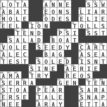 ACROSS 1. Globular water bottle used in Asia 5. Queen of England 1702-14 9. Compass dir. 12. Blind as ____ 13. Immeasurably long periods of time 14. One who doesn't tell the truth 15. Undercover agent 16. Lyric poems 17. Writer Wiesel 18. Snakelike fish 19. Electrically charged atom 21. For Whom the Bell _____ 22. Look after 24. Air pressure measure (abbr.) 26. Fast jet (abbr.) 27. Vegetable dish 28. Water vessel 29. Grand slam 30. Shabby and untidy 32. Heavy open wagon 36. Actor Baldwin 37. Container for groceries 38. At sea 39. Trial 40. Having a sole or soles 42. Is not 43. Trig term 44. Nest on high 46. Wet nurse (var.) 49. Attempt 50. Vintage cars 51. Father Junipero _ 53. Commissioned mil. rank 54. Nine, plus one 57. Portico 58. Lightbulb-shaped fruit 61. "Two Mules for Sister ____" 62. Celtic language 63. Falsehood 64. Fastener 65. Born 66. Like ___ of sunshine 67. Singer James DOWN 1. Unable to walk 2. Mitch Miller's instrument 3. Baron Munchausen's specialties 4. Had dinner 5. Age 6. Dreamland 7. Compass dir. 8. Double-curved letter 9. Beverly of Met fame 10. Travel by water 11. Take or capture by force 14. Lion 19. _ tizzy (2 wds.) 20. Likelihood 21. Teat (slang) 23. Choose 24. Puddle 25. Declare 27. Flatfish 28. Memphis, Tenn. Street 29. Large container 31. Dark wood 32. Capital of Egypt 33. Helper 34. French philosopher Descartes 35. Make lace 40. Title for a knight 41. Have the gumption 43. R.R. building 45. Car or cant ending 46. NE Netherlands city 47. Distance measurement (Brit.) 48. Came up 52. Actress Charlotte 53. Jennifer or Joel 55. Part of Q.E.F. 56. California wine valley 58. Parent Teacher Assoc. 59. Hearing organ 60. Insect wing 61. Compass dir.