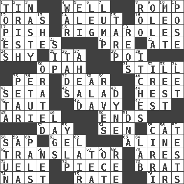 ACROSS 1. Metal container 4. Water source 8. Frolic 12. Mouths or openings 14. Native American of Southwest Alaska 16. Margarine 17. Expression of disdain 18. Frustrating wastes of time 20. _____ Park, CO 22. Before (prefix) 23. Had dinner 24. Like a shrinking violet 25. Call ___ day 28. Luau course 30. Brightly colored fish 31. Free from disturbance or agitation 35. For each 37. Letter starter 40. Algonquian 41. Bristle 42. First course 44. Command 45. Pulled tight 46. _ Jones' Locker 47. Eastern Standard Time (abbr.) 48. Satellite of Uranus 50. Extremities 52. 24 hours 54. Elected rep. 55. Domesticated feline 58. Plant excrement 61. Set 63. Place in a line 65. Interpreter 70. Ancient Greek god of war 71. Ubangi River tributary 72. Part 73. Naughty child 74. Political cartoonist Thomas 75. Assign a rank or rating to 76. Big collection agency DOWN 1. Drinks excessively 2. From or relating to Ireland 3. Thoroughly unpleasant 4. Armed conflict 5. Connecticut Ivy Leaguer 6. Part of a journey 7. Mass 8. Friend of Pooh 9. Water jar 10. Confront 11. Introduce or present, as a question 13. A female animal or person 15. Canvas cover 19. Vintage cars 21. Small drink 26. Small boys 27. Having the leading position 29. Skin irritations 30. Spoke pompously 32. Angers 33. For fear that 34. Allow 35. Lightbulb-shaped fruit 36. Needle holder 38. In the manner of 39. All-night dance parties 41. R.R. building 43. Unit of force 49. Fails to keep up a pace 51. Heredity factor (abbr.) 53. Sharp bark 55. High-altitude cloud 56. Approach 57. Trials 58. Astound 59. Length times width 60. Friends 62. Den 64. Experiment locale 66. Fish or hair follower 67. Afternoon social gathering 68. Sep. follower 69. To sift