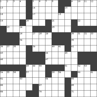 ACROSS 1. Arranges properly for use 5. Light colored 9. Create 13. Leg joint 14. Broke a traffic law 15. Less widely known 16. American tennis player Robert 17. Seigniories (variant) 19. Third day of the wk. 20. _ moment's notice (2 wds.) 21. Direct toward a target or goal 22. A saturated hydrocarbon 23. Snakelike fish 25. Small drink 26. Nest on high 30. Lightbulb-shaped fruit 34. Aches 35. Israeli folk dance 36. Water vessel 39. Profane or obscene expressions 42. Single time 43. To the inside or interior of 44. Ingested 46. Ooze 47. Chalkboard 48. Consume 51. Russian ruler of old 54. Take to court 57. Deep reverence 58. Basketball assoc. 60. Director Reiner 62. Interpreter 65. Opera by Verdi 66. Match 67. Raze (variant) 68. (Had) reclined 69. Former U.S. Attorney General Janet 70. Proofreading order 71. Singer Murray DOWN 1. Three-handed card game 2. Take place subsequently 3. Giggle 4. Observe 5. Inconspicuous attention getter 6. Capital of Western Samoa 7. Part of a journey 8. Ferber et al. 9. Make imperfect 10. Operatic vocal solo 11. Peachy ____! 12. Celtic language 15. Frolic 18. One more than two 20. At sea 24. Portable computer 27. _ de Janeiro 28. _ tizzy (2 wds.) 29. _____ Park, CO 30. Gives a jingle 31. A really long time 32. Curve 33. Actress Charlotte 36. Again 37. Single 38. Had dinner 40. Actor Linden 41. R.R. building 45. Singer James 48. Relaxation 49. Leather borer 50. Lacerates 52. Believer in; advocate of (suffix) 53. "The Thinker" sculptor 54. Play the lead 55. Goad 56. Merit 58. Characteristic smell of wine 59. Cy Young winner Saberhagen 61. Object of repulsion 63. Modern: prefix 64. Make lace 65. According to