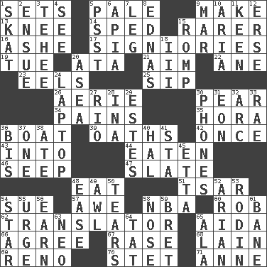 ACROSS 1. Arranges properly for use 5. Light colored 9. Create 13. Leg joint 14. Broke a traffic law 15. Less widely known 16. American tennis player Robert 17. Seigniories (variant) 19. Third day of the wk. 20. _ moment's notice (2 wds.) 21. Direct toward a target or goal 22. A saturated hydrocarbon 23. Snakelike fish 25. Small drink 26. Nest on high 30. Lightbulb-shaped fruit 34. Aches 35. Israeli folk dance 36. Water vessel 39. Profane or obscene expressions 42. Single time 43. To the inside or interior of 44. Ingested 46. Ooze 47. Chalkboard 48. Consume 51. Russian ruler of old 54. Take to court 57. Deep reverence 58. Basketball assoc. 60. Director Reiner 62. Interpreter 65. Opera by Verdi 66. Match 67. Raze (variant) 68. (Had) reclined 69. Former U.S. Attorney General Janet 70. Proofreading order 71. Singer Murray DOWN 1. Three-handed card game 2. Take place subsequently 3. Giggle 4. Observe 5. Inconspicuous attention getter 6. Capital of Western Samoa 7. Part of a journey 8. Ferber et al. 9. Make imperfect 10. Operatic vocal solo 11. Peachy ____! 12. Celtic language 15. Frolic 18. One more than two 20. At sea 24. Portable computer 27. _ de Janeiro 28. _ tizzy (2 wds.) 29. _____ Park, CO 30. Gives a jingle 31. A really long time 32. Curve 33. Actress Charlotte 36. Again 37. Single 38. Had dinner 40. Actor Linden 41. R.R. building 45. Singer James 48. Relaxation 49. Leather borer 50. Lacerates 52. Believer in; advocate of (suffix) 53. "The Thinker" sculptor 54. Play the lead 55. Goad 56. Merit 58. Characteristic smell of wine 59. Cy Young winner Saberhagen 61. Object of repulsion 63. Modern: prefix 64. Make lace 65. According to