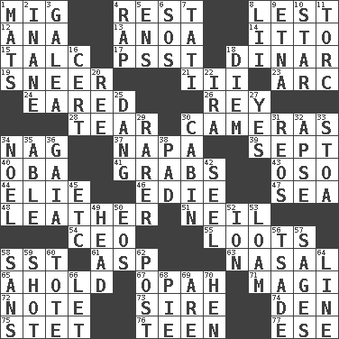 ACROSS 1. Russian fighter aircraft 4. Respite 8. For fear that 12. Santa ___, CA 13. Small Philippine buffalo 14. "Tell ____ the Marines!" 15. Baby powder 17. Inconspicuous attention getter 18. Middle Eastern gold or silver currency 19. Scornful expression 21. One more than two 23. Curve 24. Having ears or earlike features 26. Marina Del _, California 28. Pull into pieces 30. Devices for capturing images 34. Tired old horse 37. California wine valley 39. Back-to-school mo. 40. Chief or king in Benin or Nigeria 41. Catches 43. Bear (Spanish) 44. Writer Wiesel 46. Singer Brickell 47. Ocean 48. Cordwainer's material 51. Famous astronaut Armstrong 54. Corporate head (abbr.) 55. Plunders 58. Fast jet (abbr.) 61. Cleo's killer 63. Rhinal 65. Hold, grip (Informal) 67. Brightly colored fish 71. Wise men 72. Musical sound 73. Title for a man of rank and authority 74. Lair 75. Proofreading order 76. Adolescent 77. Compass dir. DOWN 1. Floor protectors 2. Silly 3. An organ shaped like a helmet 4. Strike 5. Followers of ems 6. Distress signal 7. Jacques of French films 8. Cards in a Roman deck? 9. Inactive volcano in Sicily 10. Play the lead 11. Torque (variant) 16. Foregone conclusion 18. South Vietnam president (1954) 20. Portuguese money of account (variant) 22. Lyricist Gershwin 25. Mild oath, euphamism for damn 27. Consenting reply 29. More uncommon 30. Small house or cottage 31. Vintage cars 32. Domed church section 33. Portico 34. Christmas carol 35. Competent 36. Greek goddess of the earth (variant) 38. Groovy apt. 42. Sew up the eyelids of hawks and falcons 45. And so on (abbr.) 49. Froth on beer 50. Greek goddess of the dawn 52. Electrically charged atom 53. Rich soil 56. Sadhe (variant) 57. Gurus 58. Without 59. Attempt 60. Haul 62. Mail 64. Actor's bit 66. Allow 68. Sliced dessert 69. "We ___ not amused" (Victoria) 70. Layer