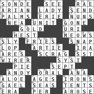 ACROSS 1. Something which is sent 6. Perceive with the eye 9. Actress Charlotte 12. Believer in; advocate of (suffix) 13. Kenny Rogers chart-topper in '80 14. Post 15. Insides of hands 16. One of the Great Lakes 17. Religious women 18. Teachers' org. 19. A single undivided whole 20. Went 21. Aureate 23. RI univ. 24. Behest 25. Catcalls? 28. Stealthy 30. Strips of potato fried in deep fat 34. Fastener 35. Trim (branches) 36. Nick name for Arthur 38. Lyricist Gershwin 39. Ancient Greek god of war 41. Strangle with an iron collar 43. Fast jet (abbr.) 44. One who wires 46. System (abbr.) 48. Sliced dessert 49. Back-to-school mo. 50. "60 Minutes" Commentator Rooney 51. Relating to the mouth 53. Santa ___, CA 56. Medicinal plant 57. Matures 58. Metal shackles 60. Highlander 61. Oceans 62. Portable shelters 63. Period 64. For each 65. Came up DOWN 1. Plant excrement 2. NW Algerian seaport 3. Mediterranean tributary 4. Break 5. Followers of ems 6. Indian skirt 7. Prepare for publication 8. Sight organ 9. One who advocates reunion 10. Queen of England 1702-14 11. Begley and Asner 13. Grant temporary use of 14. Sounds asleep 19. Extreme 20. Chewing product 22. Order of Saint Francis (abbr.) 24. Abnormally rapid or deep breathing 26. Armed conflicts 27. Petty quarrel 28. Cole _ (cabbage dish) 29. Australian parrot (variant) 31. Big collection agency 32. And so on (abbr.) 33. Title for a knight 37. Artist's stand 40. A glass for beer 42. Flimflam 45. Marina Del _, California 47. A viewer who gazes fixedly 49. Backtalk 50. Having or resembling wings 51. Double curve, resembling the letter S 52. Tail end 54. Words to Nanette 55. Pismires 56. Personal question 57. Viper 58. Call ___ day 59. Compass dir.