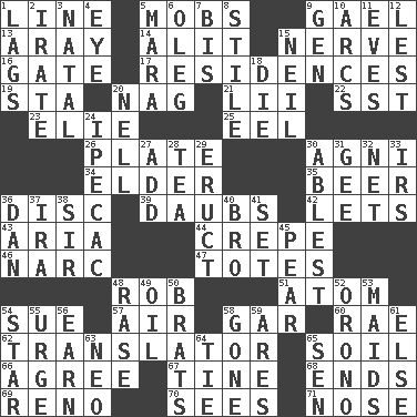 ACROSS 1. Actor's bit 5. Crowds into 9. Highlander 13. Like ___ of sunshine 14. Came down and settled, as after flight 15. Effrontery 16. Yard entry 17. Homes 19. R.R. building 20. Tired old horse 21. Cards in a Roman deck? 22. Fast jet (abbr.) 23. Writer Wiesel 25. Snakelike fish 26. Food holder 30. Hindu god of fire 34. A person who is older than you are 35. Fermented drink made from hops 36. Plate 39. Applies to a surface 42. Allows 43. Operatic vocal solo 44. Streamer paper 46. Drug cop 47. Hauls 48. Director Reiner 51. Smallest unit of an element 54. Take to court 57. Wind 58. Slender fish 60. Actress Charlotte 62. Interpreter 65. Land 66. Match 67. Prong on a fork 68. Conclusions 69. Former U.S. Attorney General Janet 70. Observes 71. Sense of smell DOWN 1. Fails to keep up a pace 2. Feeling or showing extreme anger 3. Brizilian seaport 4. Sight organ 5. Hindu Mythology: god of death 6. Cassini of fashion 7. Twice 8. Vertical member of a panel or frame 9. Commissioned mil. rank 10. Arches 11. Nights before holidays 12. For fear that 15. Famous astronaut Armstrong 18. Pass on 20. 1994 drama film starring Jodie Foster 24. Medicinal drug used to evoke vomiting 27. Say or write further 28. Beverage made from leaves 29. Spew [out] 30. Most capable 31. Unit of force equal to gravity 32. Fish or hair follower 33. Big collection agency 36. Daniel's nick name 37. Lyricist Gershwin 38. Title for a knight 40. Sis' sibling 41. Arrange properly for use 45. Lightbulb-shaped fruit 48. Raze (variant) 49. Petroleum 50. Naughty children 52. U. of Maine site 53. Women servants 54. Play the lead 55. Goad 56. Merit 58. Went 59. Ancient Greek god of war 61. Otherwise 63. Modern: prefix 64. Standoff 65. Elected rep.