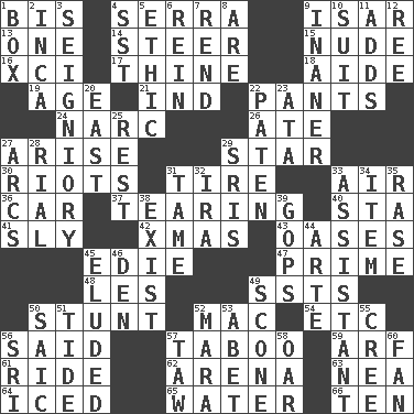 ACROSS 1. Altar cloth linen 4. Father Junipero _ 9. Austrian river, tributary to the Danube 13. Single 14. Guide 15. Unadorned 16. One more than ninety 17. One or ones belonging to thee 18. Assistant 19. Grow older 21. Indiana (abbr.) 22. Leg coverings 24. Drug cop 26. Had dinner 27. Originate 29. Play the lead 30. Debaucheries 31. Hoop that covers a wheel 33. Atmosphere 36. Auto 37. Pulling apart 40. R.R. building 41. Mischievous 42. Dec. holiday 43. Fertile tracts in a desert 45. Singer Brickell 47. A-one 48. French article 49. Fast planes 50. Difficult or unusual or dangerous feat 52. Apple computer (short form) 54. And so on (abbr.) 56. Expressed in words 57. Off limits 59. Sandy's bark 61. Travel on or in a vehicle 62. Sports stadium 63. Teachers' org. 64. On the rocks 65. Wetness 66. Nine, plus one DOWN 1. Gift holder 2. South American Indian 3. Signiory (variant) 4. Fast jet (abbr.) 5. Moral principle 6. It's straight from the horse's mouth 7. Tear apart 8. "We ___ not amused" (Victoria) 9. More empty; more void 10. Set or collection 11. Sums up 12. Portuguese money of account (variant) 20. Compass direction 22. Eucharist need 23. _ moment's notice (2 wds.) 25. Respite 27. Curves 28. Monetary unit of Yemen 29. Indian titles of respect 31. Not wild 32. Lyricist Gershwin 33. Aide 34. Detail 35. Raze (variant) 38. Be 39. Republicans 44. Johnson of "Laugh-In" 45. Dodged 46. Lair 49. Biscuitlike quick bread 50. Ketch in the Levant 51. Event that recurs at intervals 52. Hindu Mythology: god of death 53. Collude with 55. Algonquian 56. _ Lanka 57. The 23rd letter of the Hebrew alphabet 58. Boat paddle 60. Air blower
