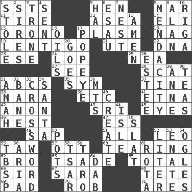 ACROSS 1. Fast planes 5. Layer 8. Spoil 11. Hoop that covers a wheel 12. Toward the sea 14. Connecticut Ivy Leaguer 15. U. of Maine site 17. Suffix with ecto or cyto 18. Tired old horse 19. Small, flat, pigmented spot on the skin 21. Shoshoni 22. Heredity factor (abbr.) 23. Compass dir. 24. Chop off 25. Teachers' org. 27. Observe 28. Jazz singing style 31. Lettered men learn these first 35. Symbol (abbr.) 37. Prong on a fork 38. Hindu Mythology: god of death 39. And so on (abbr.) 41. Inactive volcano in Sicily 42. At once, immediately (arch.) 43. _ Lanka 45. Sight organs 46. Behest 47. Double-curved letter 49. Plant excrement 51. 100% 52. Lion 55. The 23rd letter of the Hebrew alphabet 57. Baseball player Mel 60. Separating forcefully 62. Sis' sibling 63. Sadhe (variant) 65. "_____ Recall" 66. Title for a knight 67. "Two Mules for Sister ____" 68. False hair 69. Writing tablet 70. Director Reiner 71. Ancient Greek god of war DOWN 1. Fur scarf 2. Male parents of animals 3. Marketplace scale 4. Transmitted 5. Actor Linden 6. Son of Isaac 7. A home for chicks 8. Ananias' fault 9. Actor Alda or Thicke 10. Capital of Latvia 13. So be it 16. Lubricates 17. Wimpy's pal 20. Travels 26. First name in cosmetics 29. Singer Murray 30. Afternoon social gatherings 31. Nanny 32. Object of repulsion 33. What you're doing now 34. Before Barbara or Clara 36. Mountains (abbr.) 40. Cause to be 44. Small island 48. Narrow board 50. Plant holders 52. 61 cubic inches 53. Maternal 54. Stares at amorously 55. Cook's measure (abbr.) 56. Operatic vocal solo 58. Russian ruler of old 59. Pacific island yam 61. Round or rotation of duties 64. Pat or tap gently